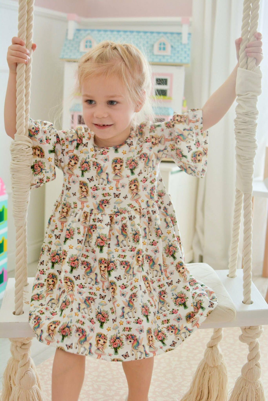 Dziewczęca sukienka z motywem jednorożca w kolorze brudnego różu Ta urocza sukienka jednorożec dla dziewczynek...