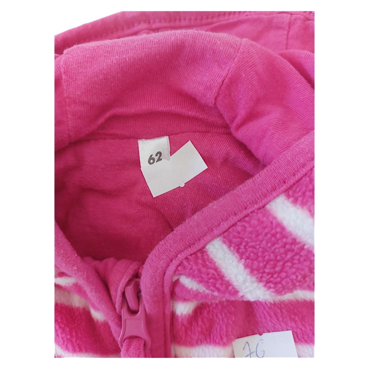 Ta różowa bluza z miękkiego materiału z pewnością przypadnie do gustu każdej małej trendsetterce. Posiada kaptur oraz zamek błyskawiczny, co ułatwia zakładanie i zdejmowanie. Dodatkowo charakteryzuje się pionowymi paskami, które nadają jej wyjątkowy wygląd. Idealnie sprawdzi się na chłodniejsze dni, zapewniając ciepło i wygodę. Jest używana, lecz w dobrym stanie.
