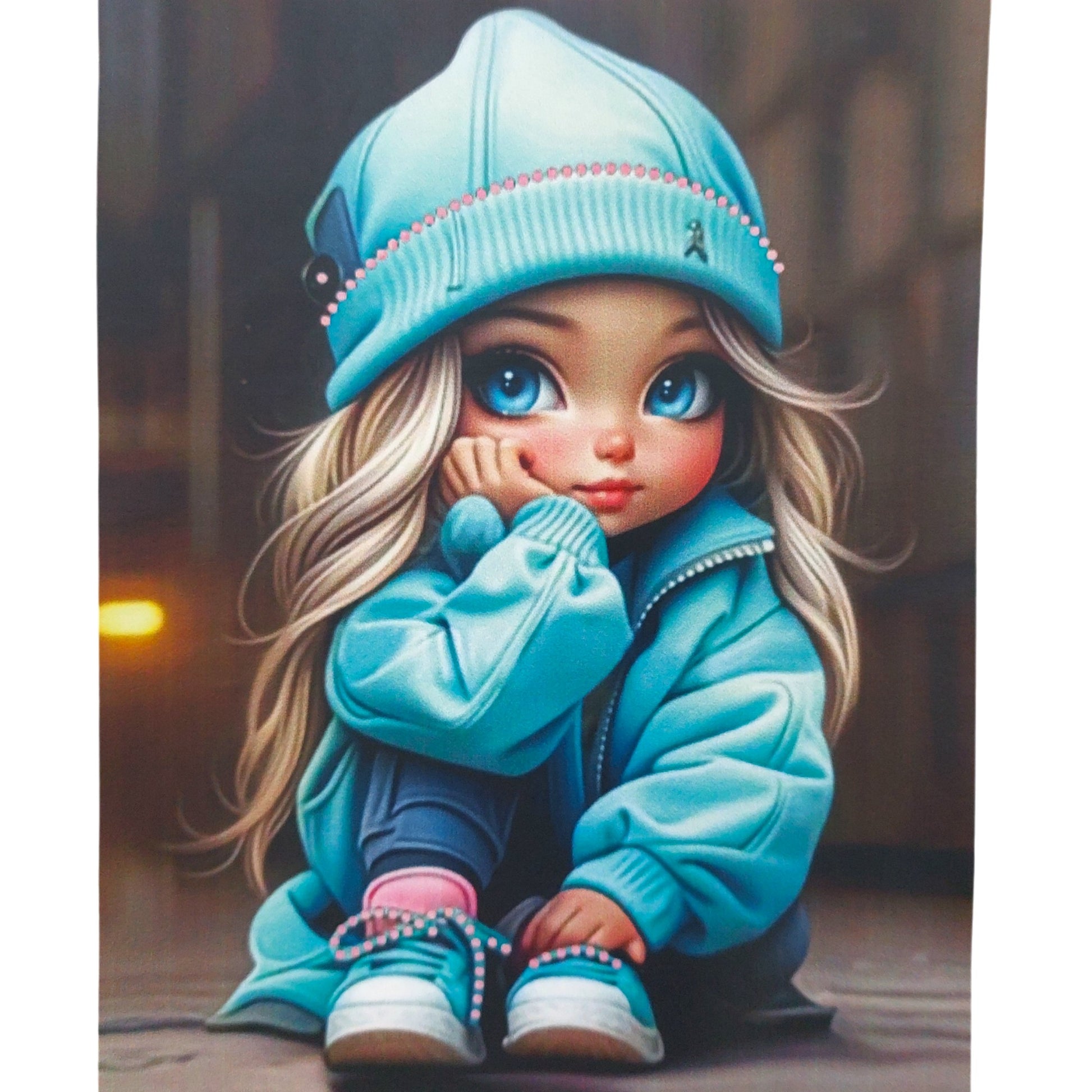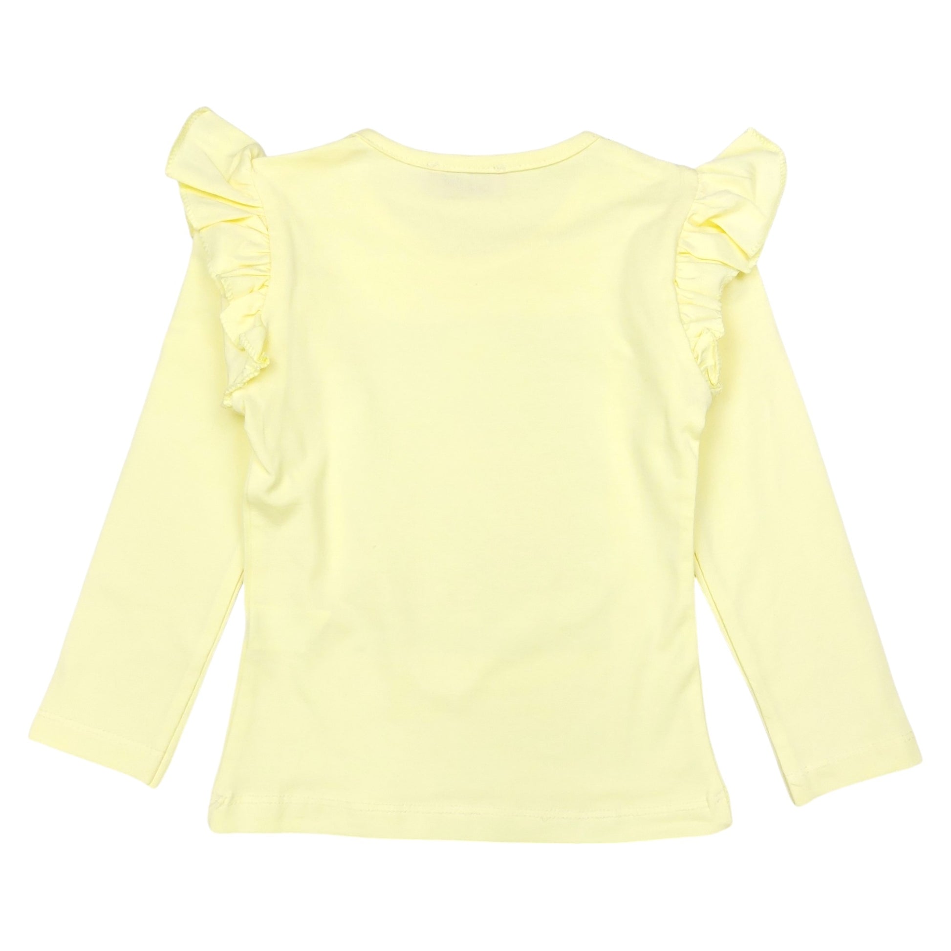 Bluzka charakteryzuje się uroczym nadrukiem dziewczynki w błękitnej czapce, który przyciąga wzrok i nadaje całości modnego wyglądu. Żółty kolor bluzki jest radosny i pełen energii, co sprawia, że świetnie sprawdzi się zarówno w codziennych stylizacjach, jak i na bardziej wyjątkowe okazje. Długie rękawy oraz falbanki na ramionach dodają jej delikatności i subtelności, podkreślając dziewczęcy charakter stroju.