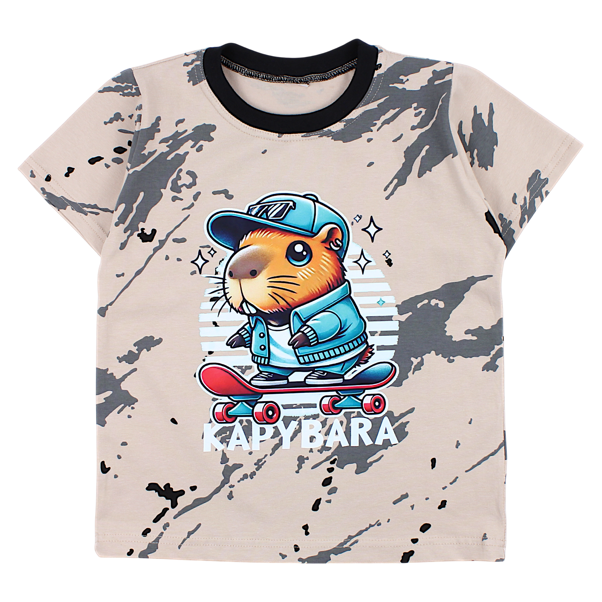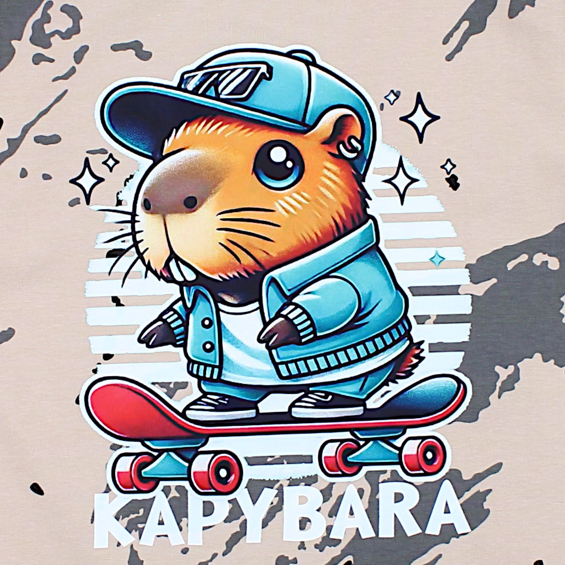 Bluzka chłopięca w kolorze beżowym z wyrazistym nadrukiem przedstawiającym postać na deskorolce. Posiada krótkie rękawy i okrągły dekolt z czarną lamówką. Wykonana z miękkiej, przyjaznej dla skóry bawełny. Idealna na sezon wiosna-lato.