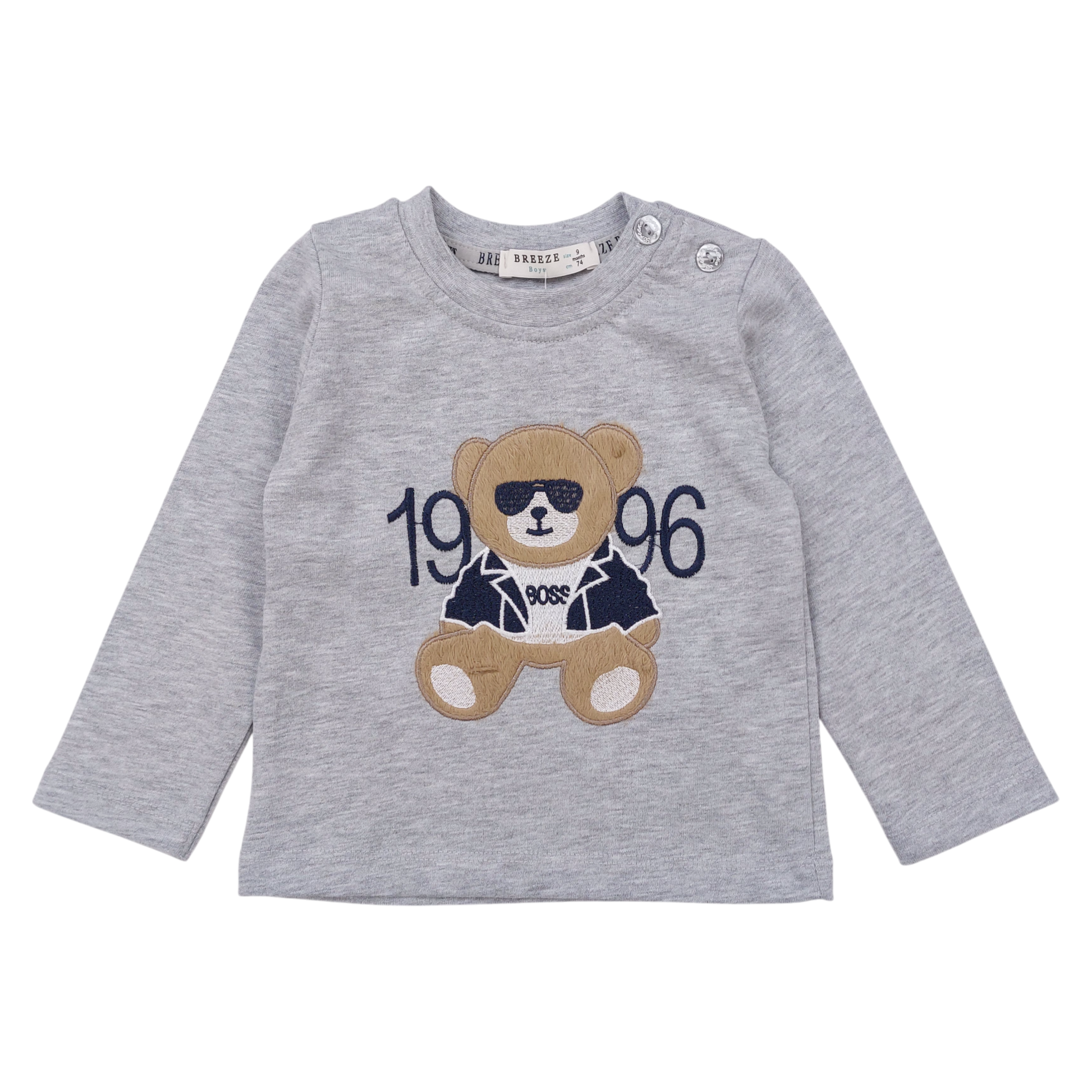 Model posiada długie rękawy, co sprawia, że jest odpowiedni na chłodniejsze wiosenne dni oraz letnie poranki. Urocza aplikacja z misia w okularach, otoczonego napisem "1996", nadaje bluzce modnego i zabawnego charakteru, który przypadnie do gustu każdemu małemu miłośnikowi zwierząt. Subtelny szary kolor sprawia, że bluzka jest uniwersalna i łatwa do łączenia z innymi elementami garderoby.