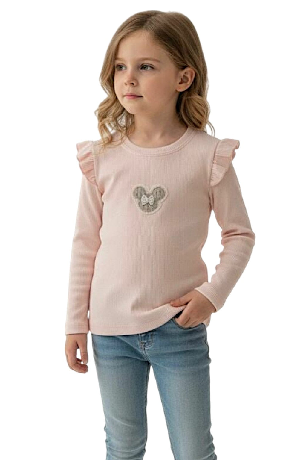 Dziewczęca bluzka prążkowana z motywem Myszki w pudrowym różu