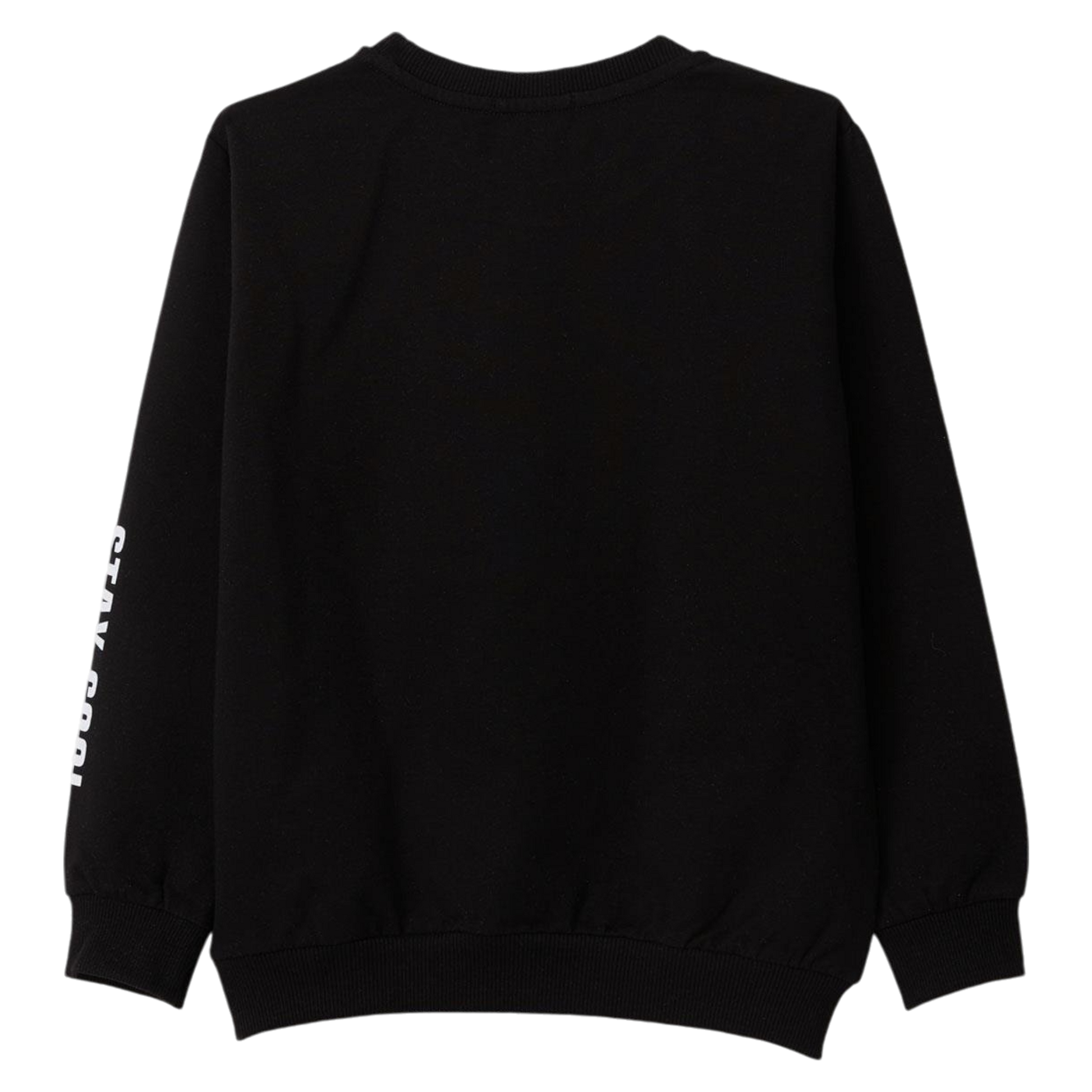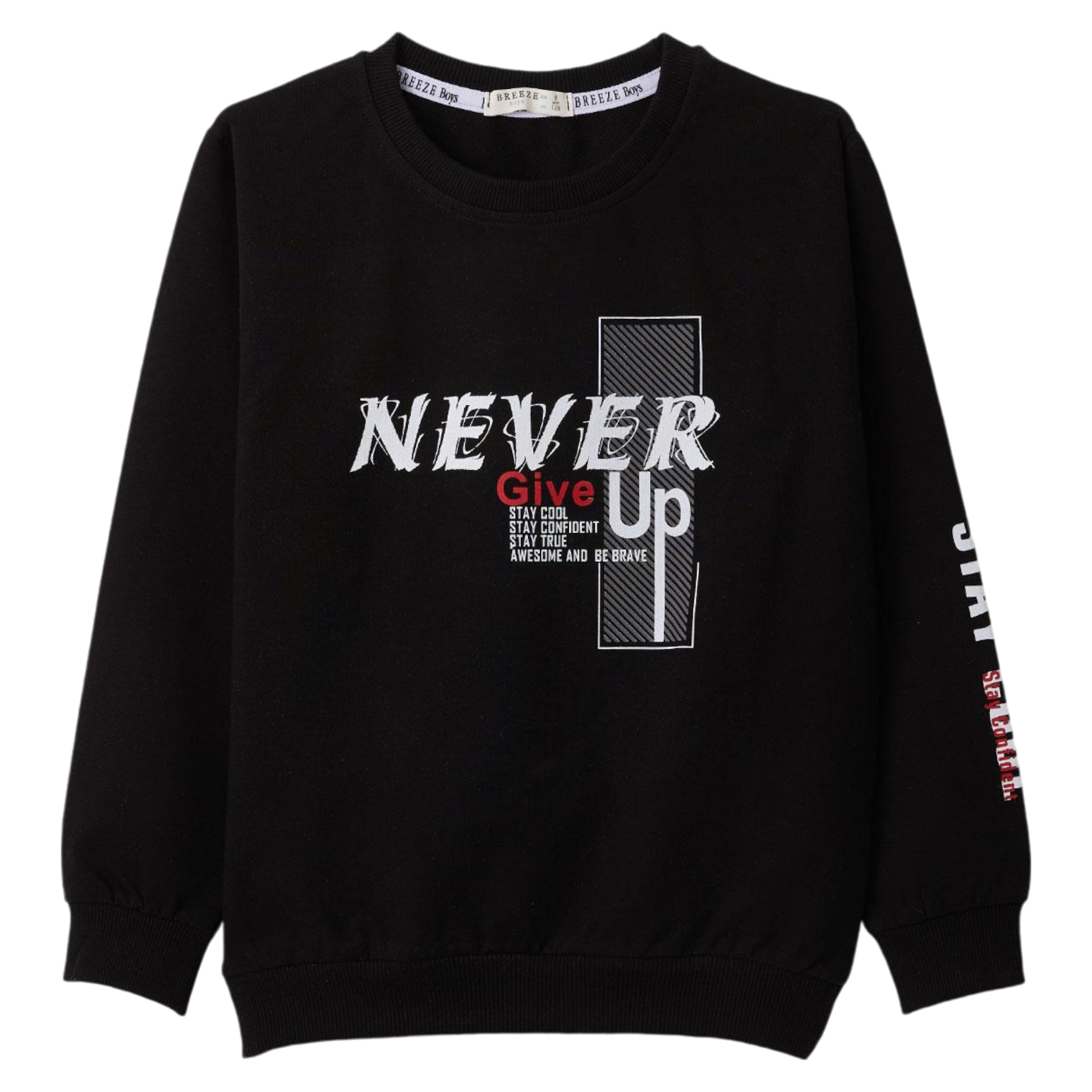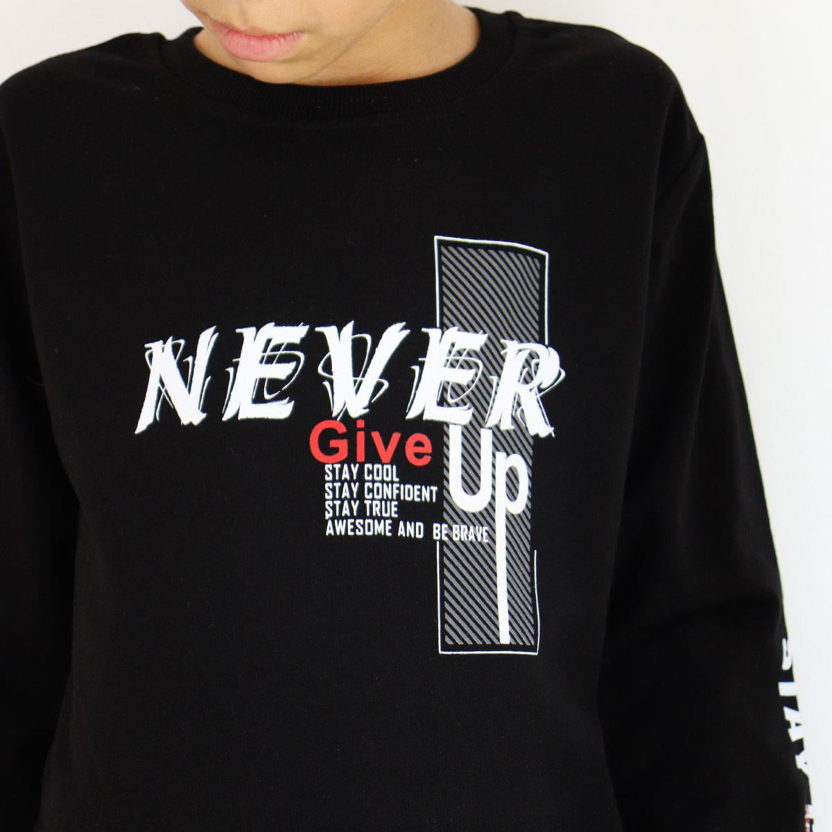 Cienka bluza chłopięca z kolekcji jesień-zima, kolor czarny, z napisem "NEVER GIVE UP" na przodzie. Wzbogacona o inspirujące hasła: "Stay cool, stay confident, stay true, awesome and be brave". Długie rękawy z dodatkowymi nadrukami "STAY COOL" na rękawach dodają sportowego charakteru. Idealna na chłodniejsze dni, lekka i wygodna. Brak kieszeni i zapięć sprawia, że bluza jest łatwa do zakładania, a elastyczne ściągacze na rękawach i u dołu zapewniają komfort noszenia.