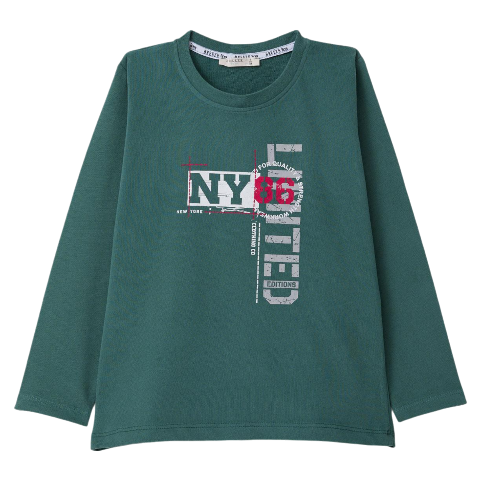 Stylowa, ciepła bluzka chłopięca z kolekcji jesień-zima, w kolorze morskim. Przód ozdobiony dynamicznym nadrukiem "NY 86 LIMITED EDITION". Długie rękawy i brak kieszeni oraz zapięć sprawiają, że bluzka jest wygodna w codziennym noszeniu. Wykonana w całości z miękkiej i przewiewnej bawełny, zapewnia komfort i ciepło na co dzień.