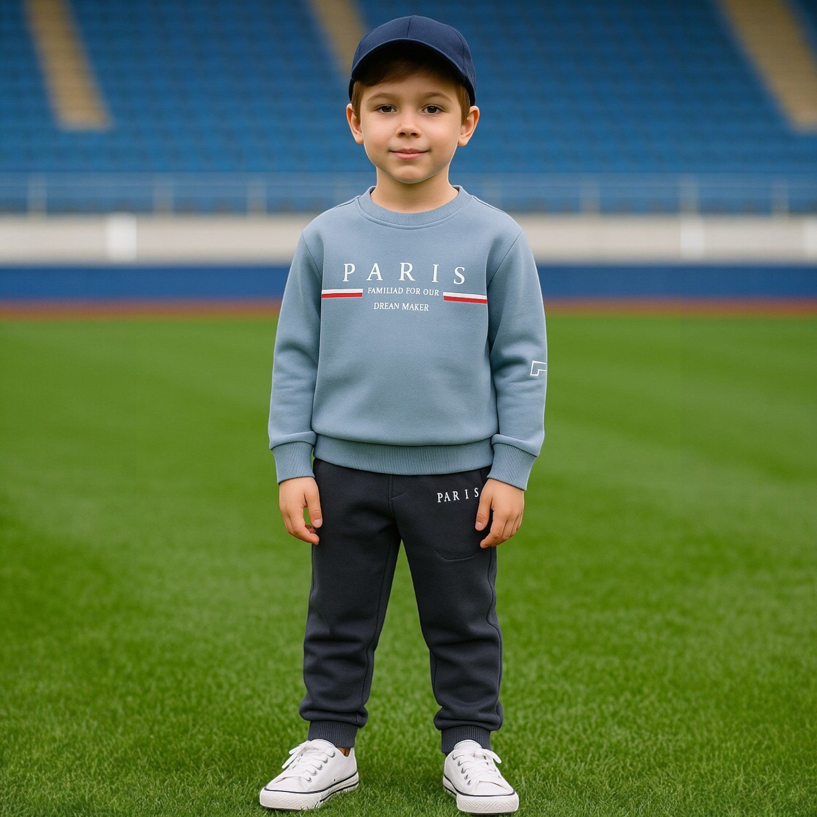 Stylowy dres chłopięcy na sezon jesień-zima w kolorze niebieskim. Zestaw składa się z wygodnej bluzy z nadrukiem "Paris" oraz spodni dresowych z kieszeniami. Idealny na chłodniejsze dni, zapewnia komfort i modny wygląd.