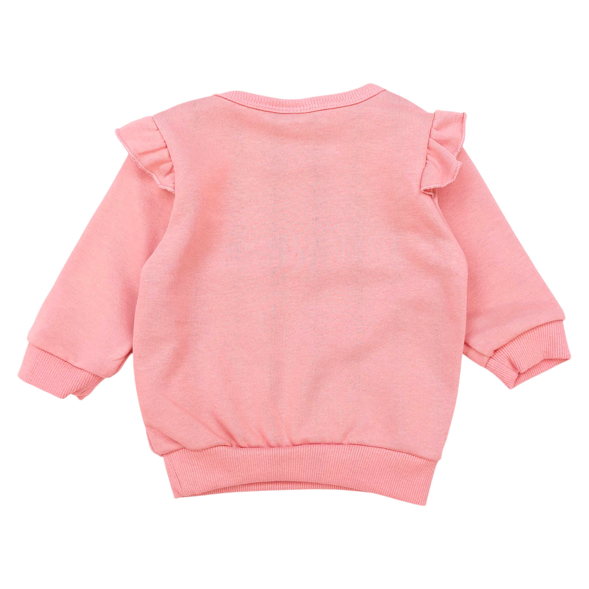 Uroczy dres dziewczęcy Mini World to połączenie wygody i stylu, stworzone z myślą o małych miłośniczkach mody. Bluza w delikatnym odcieniu fango wyróżnia się pięknym nadrukiem "Love Grow Peace" ozdobionym brokatowym wykończeniem oraz subtelnymi falbankami na ramionach, które dodają jej dziewczęcego charakteru. Zapięcie na ramieniu ułatwia zakładanie, zapewniając komfort użytkowania.