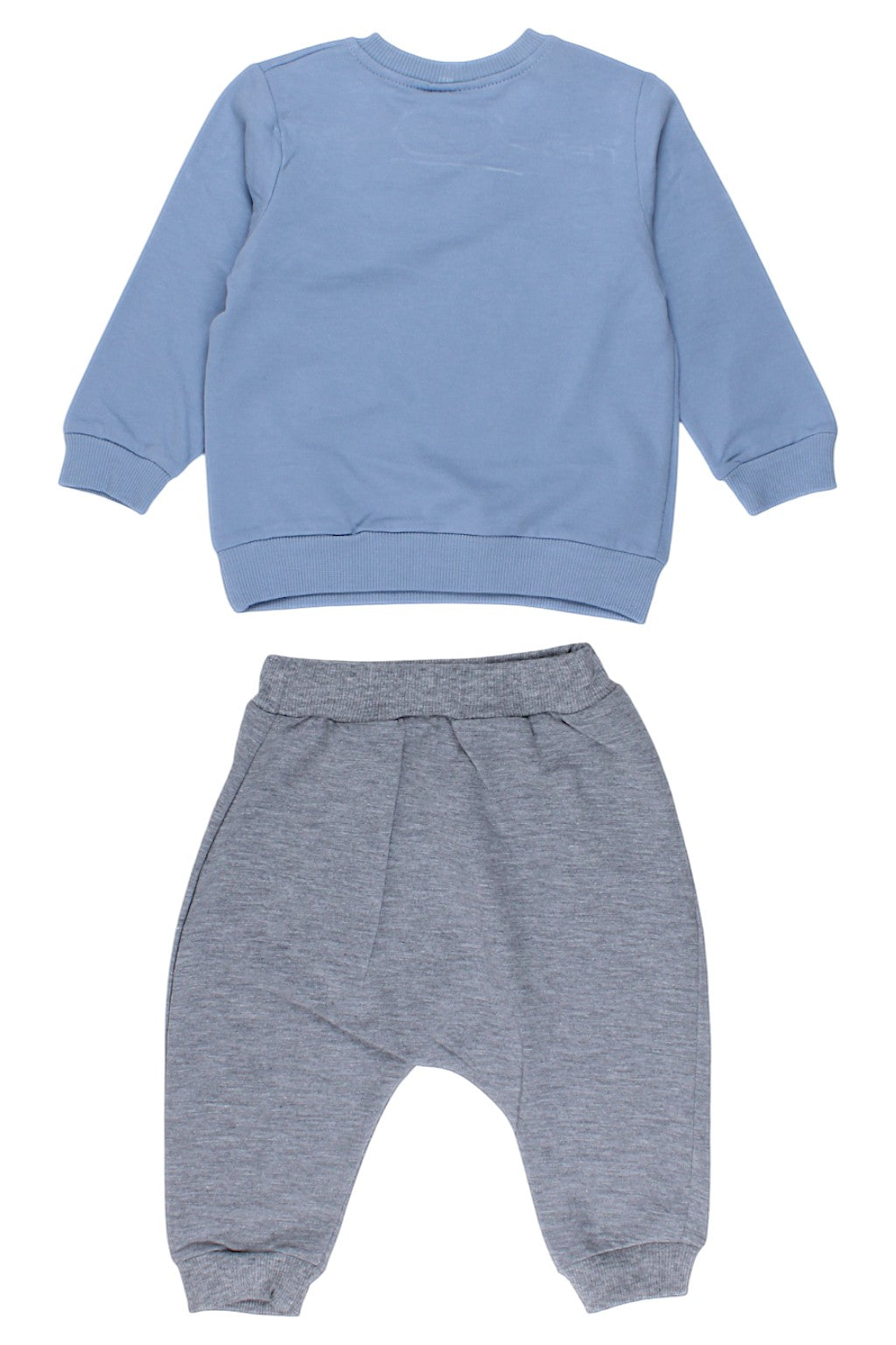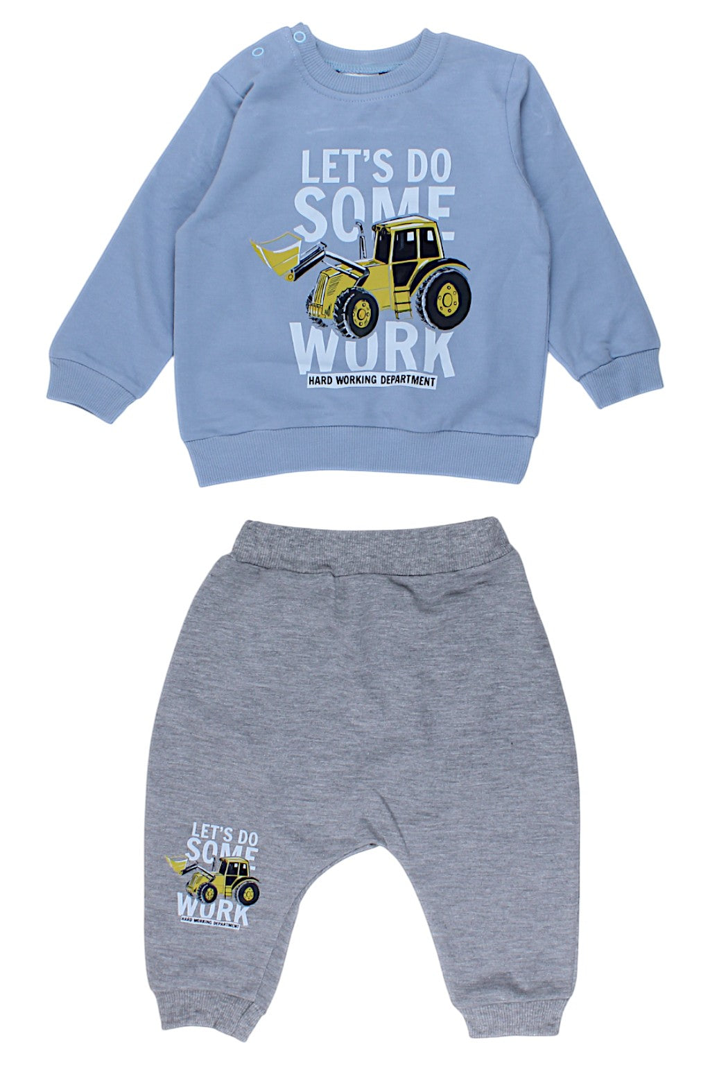 Przód bluzy zdobi efektowny wzór z koparką, co z pewnością przypadnie do gustu małym fanom maszyn budowlanych. Tył bluzy jest gładki, co dodaje jej uniwersalnego charakteru. Spodnie mają elastyczny pas, co pozwala na swobodne dopasowanie do sylwetki dziecka, a dodatkowa regulacja sznureczkiem zapewnia jeszcze większą wygodę. Elastyczne ściągacze na nogawkach sprawiają, że spodnie świetnie leżą i nie przeszkadzają w zabawie.