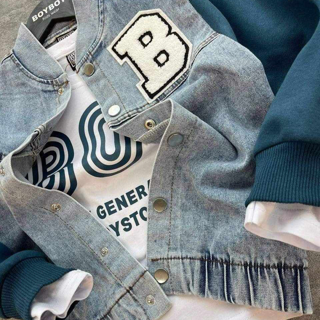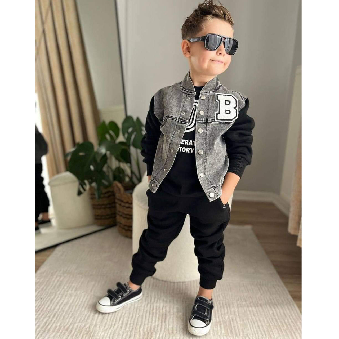 Pierwszym elementem tego zestawu jest bluza chłopięca o oryginalnym designie, łącząca jeans z bawełną. Ta innowacyjna kombinacja materiałów nadaje bluzie sportowego, ale jednocześnie nowoczesnego charakteru. Bluza zapinana na zatrzaski jest niezwykle praktyczna, łatwa do zakładania i zdejmowania, co jest ważne w codziennym użytkowaniu. Na przodzie znajduje się wyraziste logo w formie naszywki „B”, które dodaje stylu i nowoczesnego akcentu. Bluza posiada długie rękawy wykonane z bawełny, co sprawia, że jest ciepła i komfortowa, idealna na chłodniejsze dni.