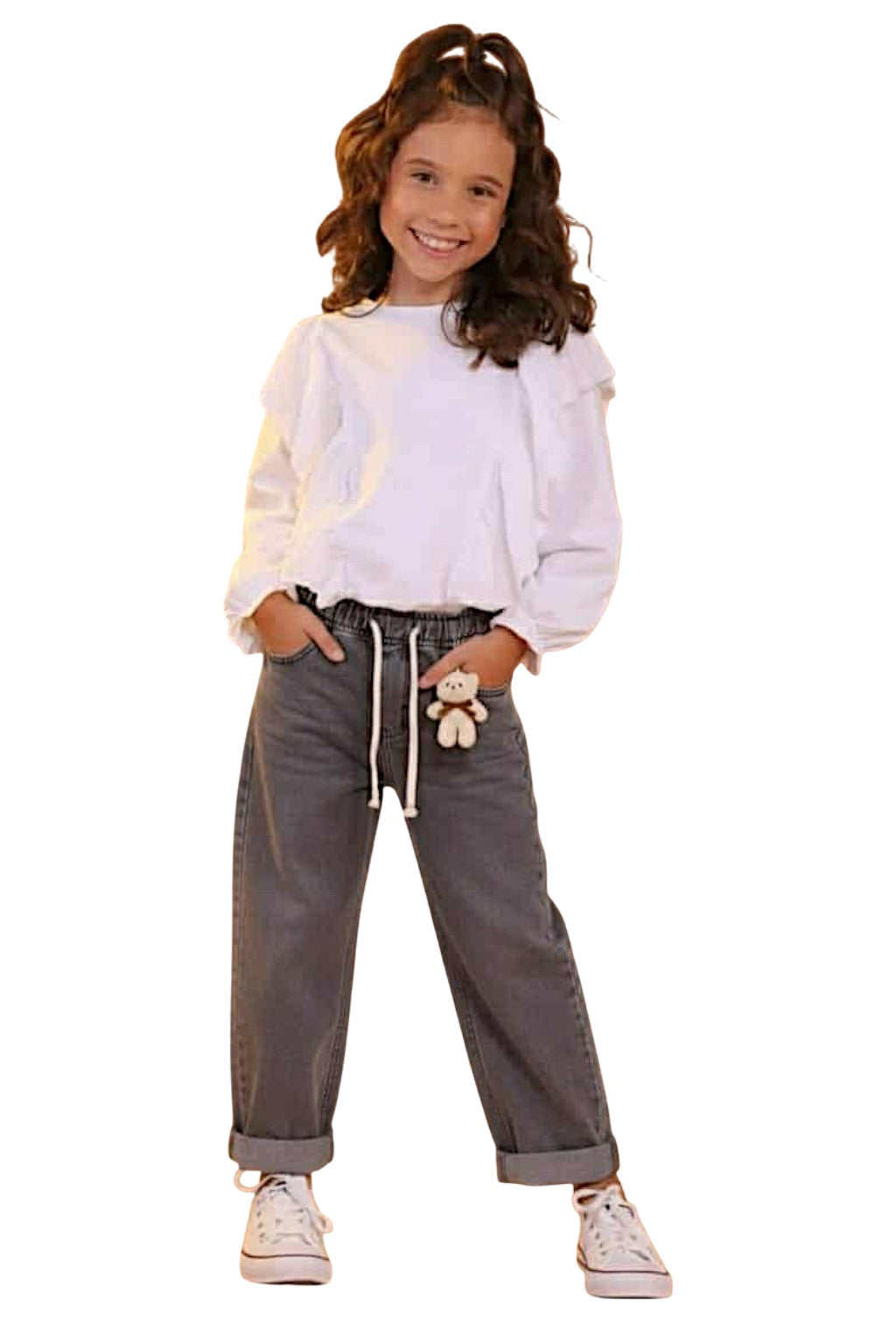 Te urocze jeansowe kuloty dla dziewczynek to idealny wybór na chłodniejsze dni. Wykonane z wysokiej jakości materiału, łączą w sobie styl i wygodę. Przód kulotów zdobi subtelny motyw misia, który dodaje im dziecięcego uroku. Kuloty są w eleganckim czarnym kolorze, co sprawia, że są uniwersalne i łatwe do zestawienia z różnymi elementami garderoby. Spodnie posiadają praktyczne kieszenie, które są nie tylko ozdobą, ale również funkcjonalnym dodatkiem. Elastyczny pas zapewnia komfort noszenia i łatwość zakładania, co jest szczególnie ważne dla dzieci. Kuloty są idealne na sezon jesień-zima, doskonale chronią przed chłodem, a jednocześnie pozwalają skórze oddychać. Dzięki swojej uniwersalności, można je nosić zarówno na co dzień, jak i na specjalne okazje. To doskonały wybór dla każdej dziewczynki, która chce wyglądać modnie i czuć się komfortowo.