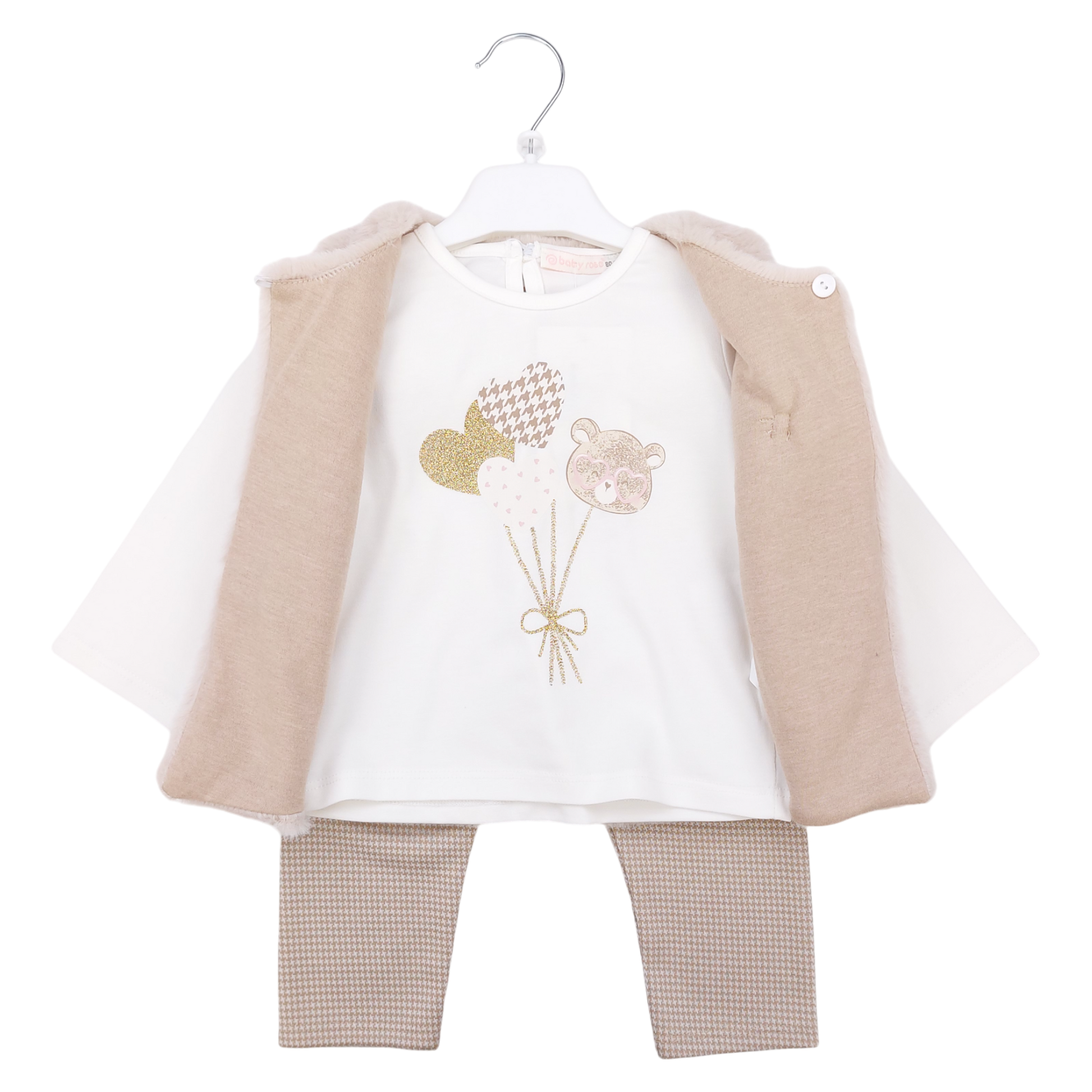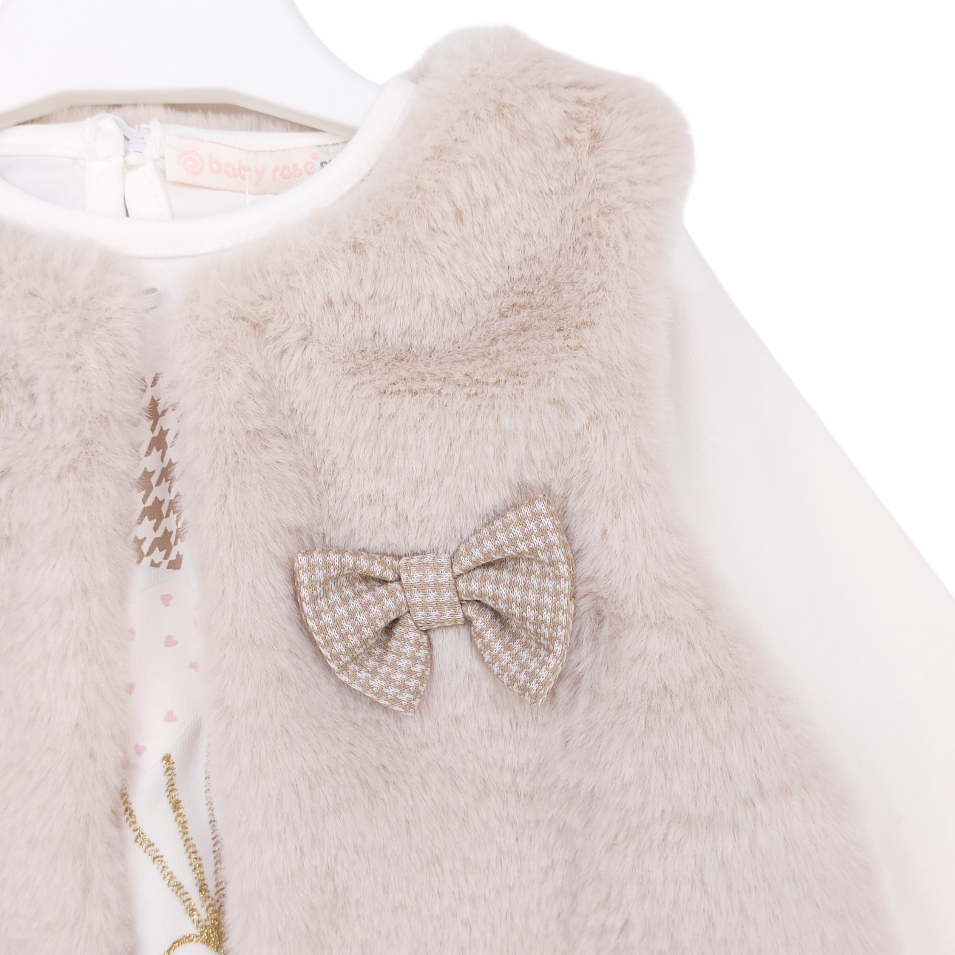 Uroczy komplet dla dziewczynki składający się z trzech części: miękkiej, beżowej kamizelki z ozdobną kokardką, białej bluzki z długim rękawem oraz wzorzystych legginsów. Idealny na chłodniejsze dni sezonu jesienno-zimowego. Kamizelka posiada przyjemny, futerkowy materiał, który zapewnia ciepło i dodaje elegancji. Bluzka zdobiona jest uroczym nadrukiem z motywem zwierzęcym i serduszkami, co nadaje jej wyjątkowego charakteru.