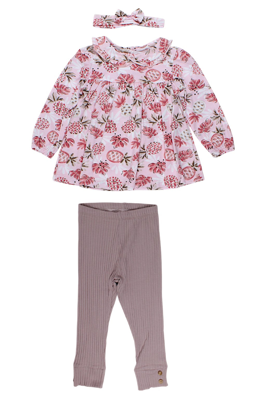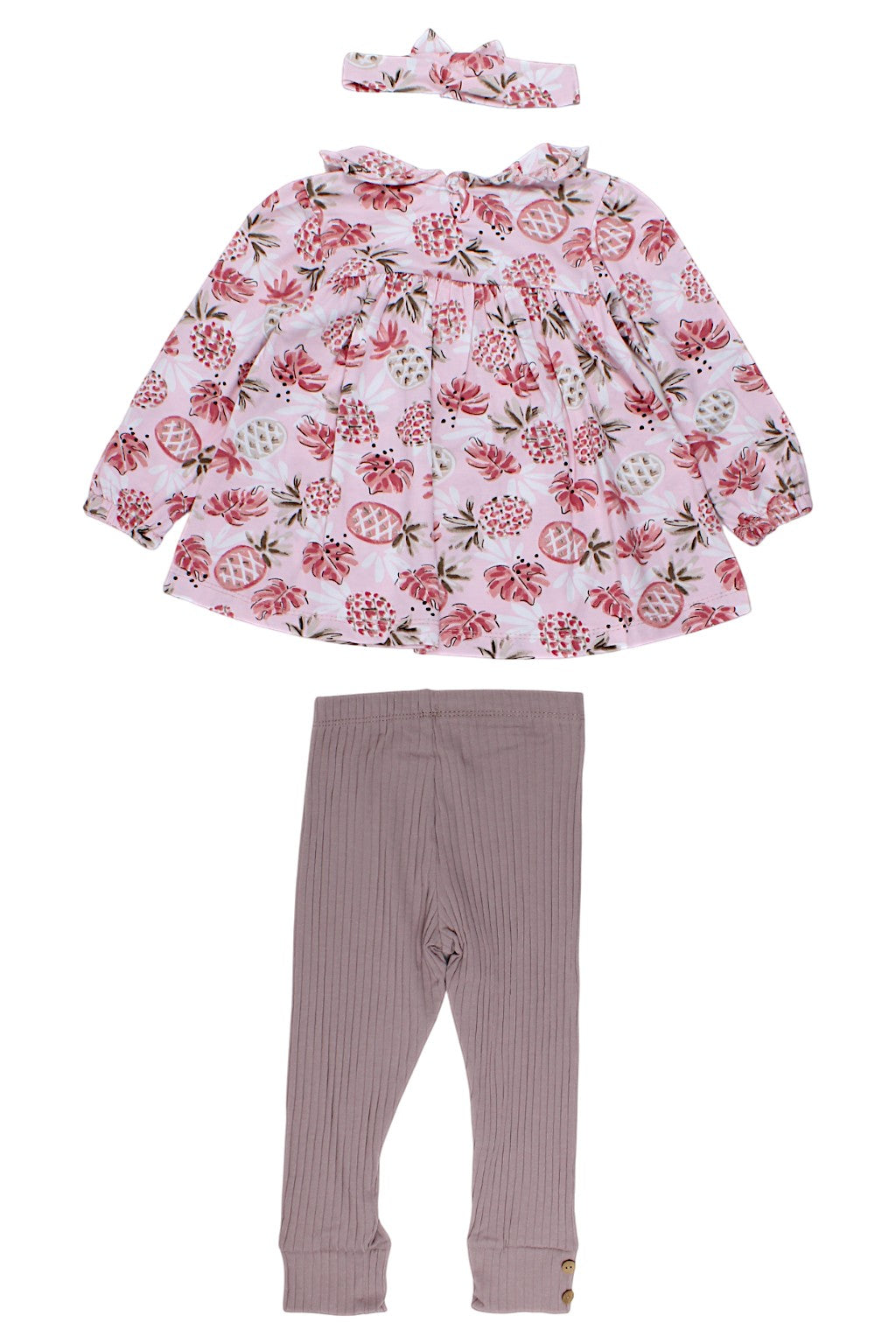 Ten uroczy dziewczęcy komplet składa się z trzech części i jest idealny na sezon wiosna-lato. W zestawie znajdziemy bluzkę, getry oraz opaskę — wszystkie elementy doskonale ze sobą współgrają, tworząc spójną i modną stylizację. Bluzka wykonana z miękkiego materiału ma krótkie rękawki, co czyni ją doskonałą na cieplejsze dni. Z przodu wyróżnia się subtelny wzór, który dodaje jej uroku. Tył bluzki jest prosty i zapewnia swobodę ruchów. Getry są w jednolitym beżowym kolorze, elastyczne i dobrze dopasowujące się do sylwetki, dzięki czemu dziecko czuje się w nich komfortowo przez cały dzień. Dodają szyku i stanowią wygodną bazę dla reszty stylizacji. Opaska jest również w beżowym kolorze i stanowi doskonałe dopełnienie zestawu, dodając mu elegancji i charakteru. Cały komplet jest zaprojektowany z myślą o wygodzie i stylu małych dziewczynek, a jego neutralny kolor sprawia, że można go łączyć z innymi elementami garderoby.