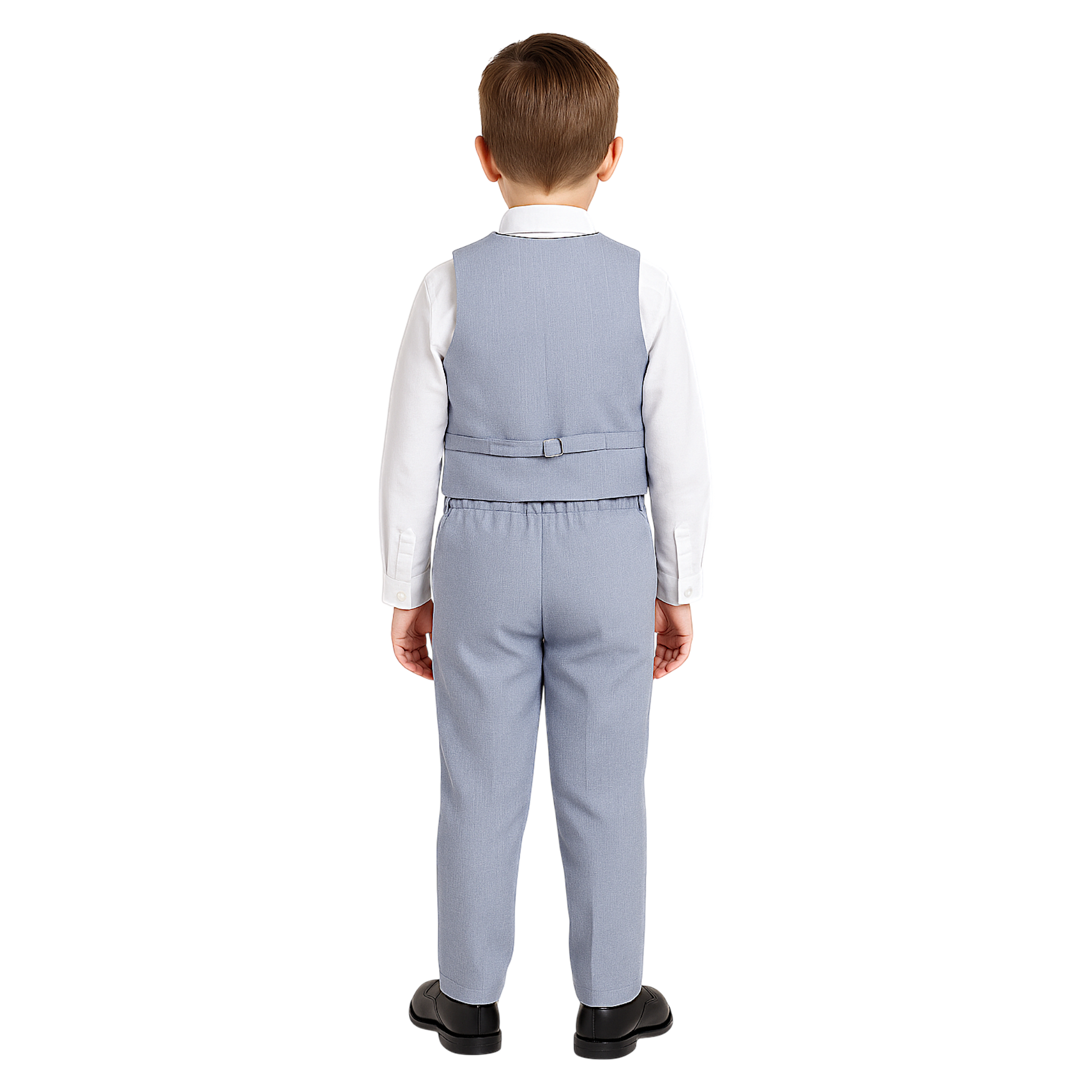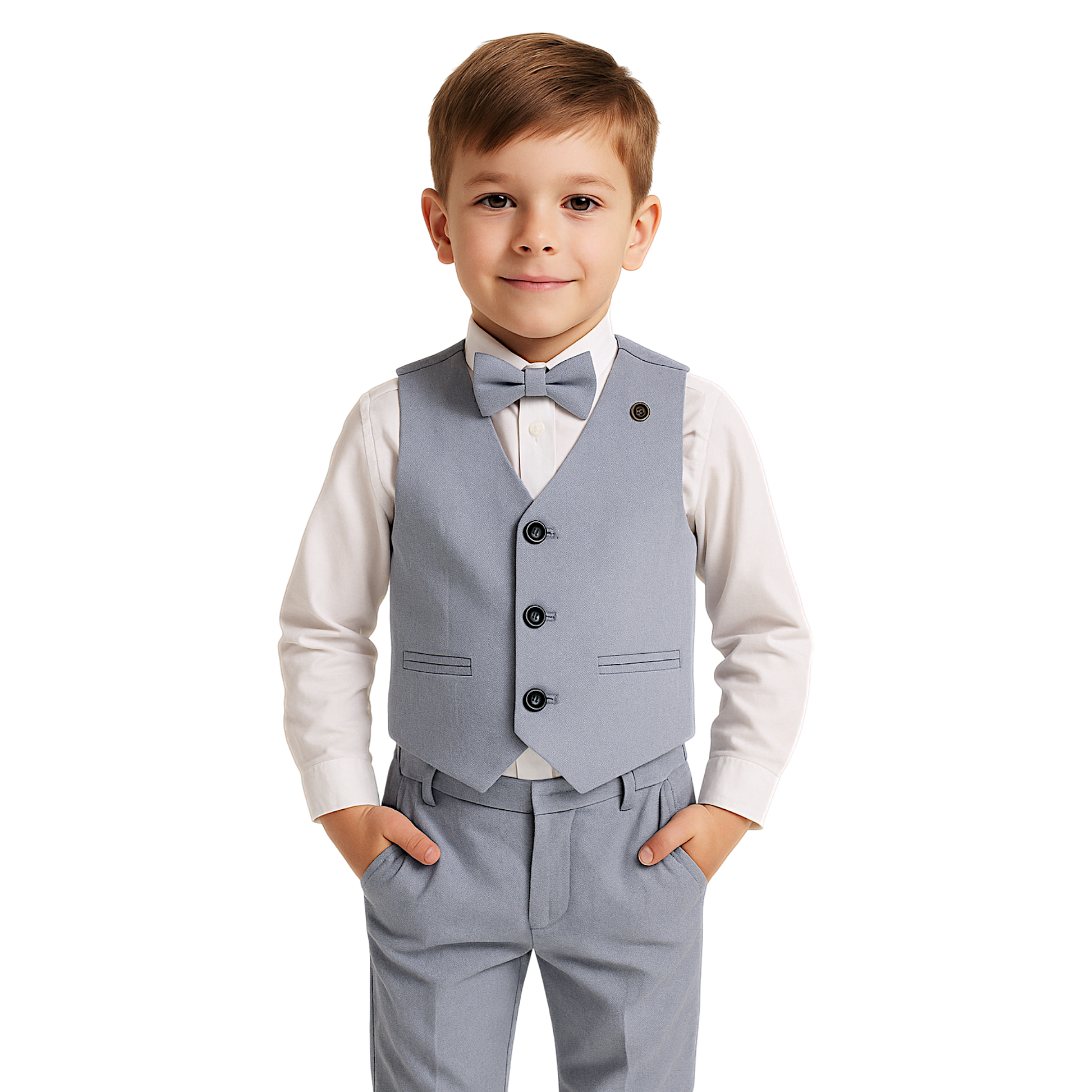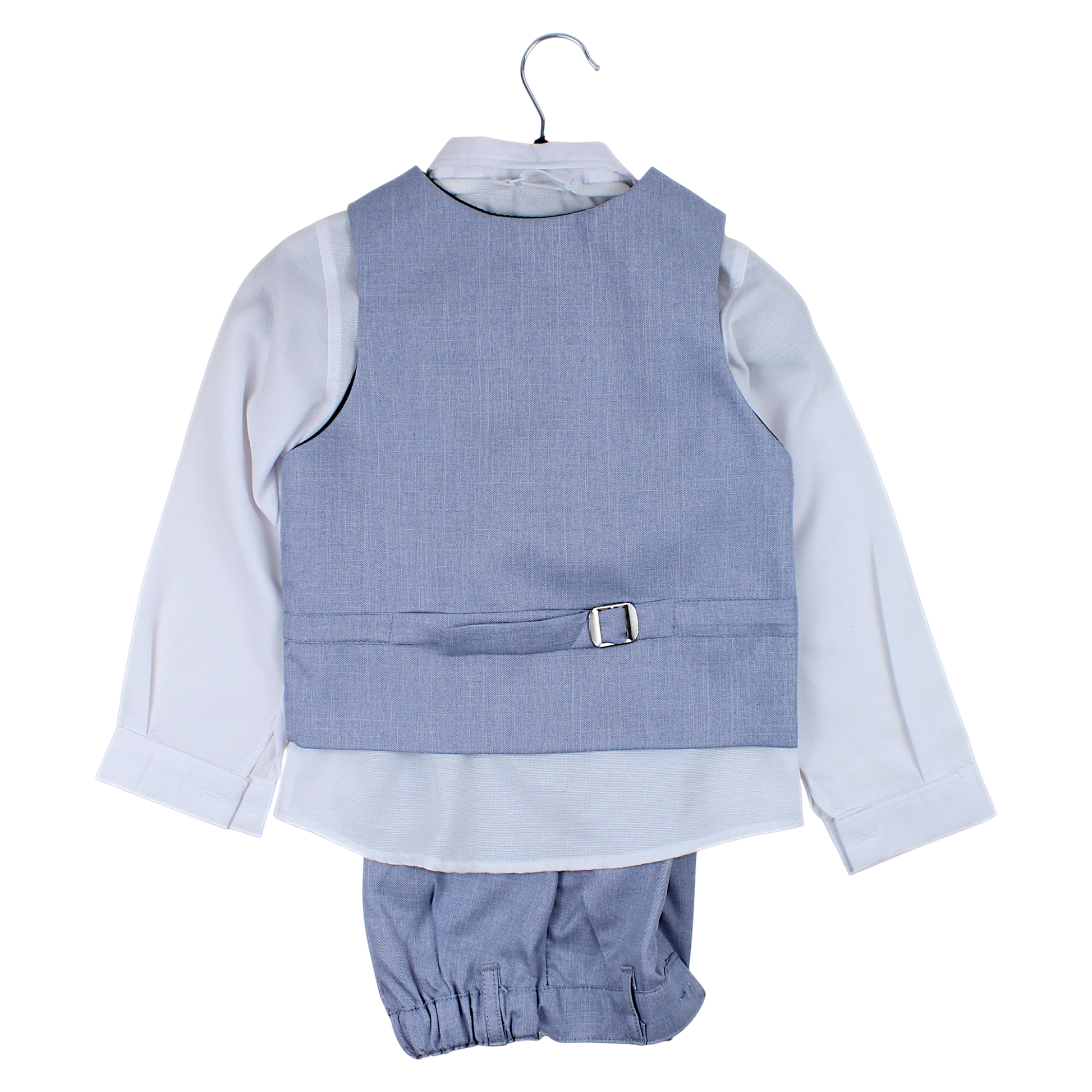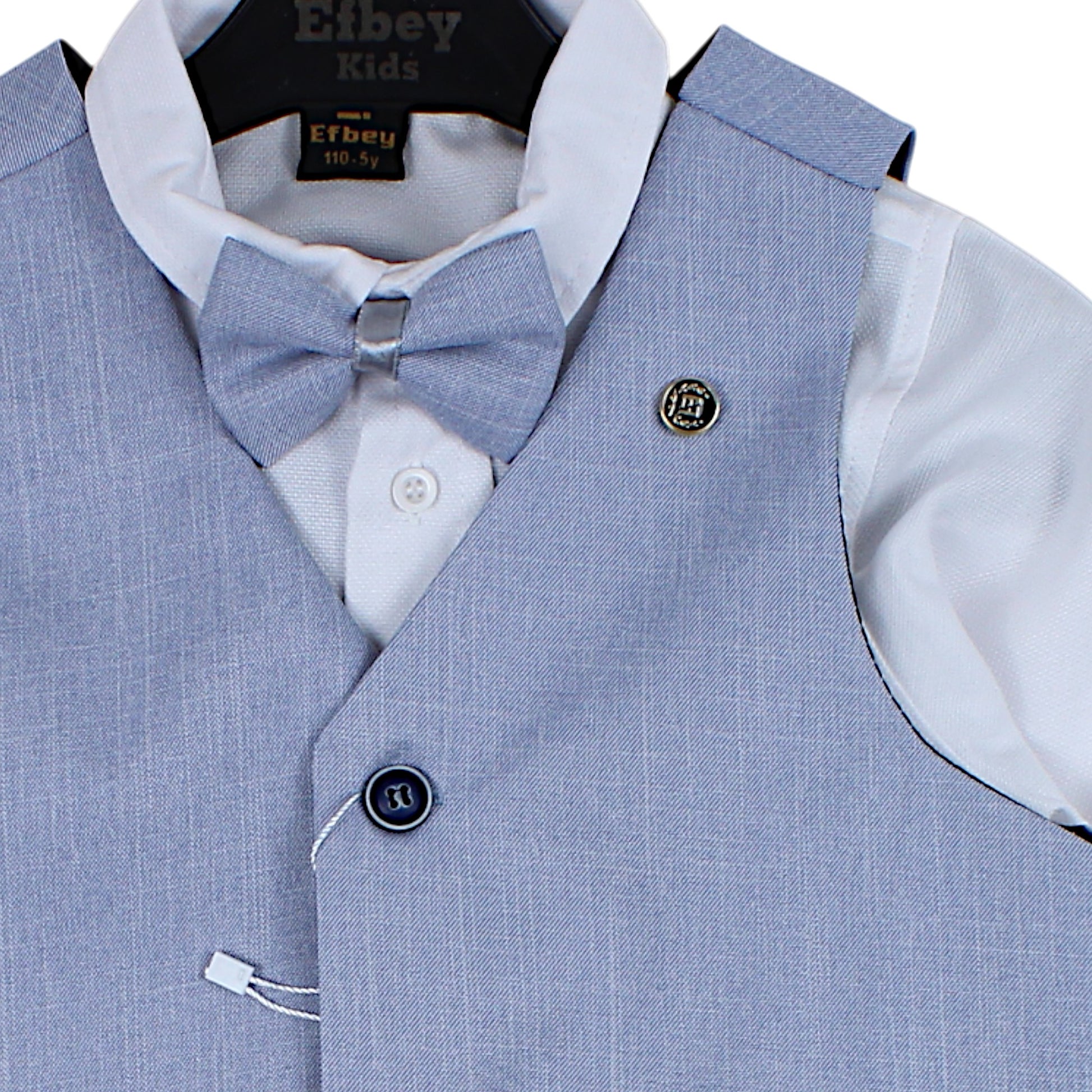 Przedstawiamy elegancki komplet chłopięcy w kolorze niebieskim, idealny na specjalne okazje w sezonie wiosna-lato. Komplet składa się z czterech uzupełniających się części. Zawiera elegancką koszulę z długimi rękawami, zapinaną na guziki z przodu. Kamizelka oraz spodnie dodają uroku i wyróżniają się klasycznym, schludnym designem. Całość dopełnia gustowna muszka, która nadaje wyrafinowanego charakteru. Komplet wykonany jest z dbałością o szczegóły, co zapewnia komfort noszenia i trwałość. Doskonały wybór dla małych dżentelmenów.