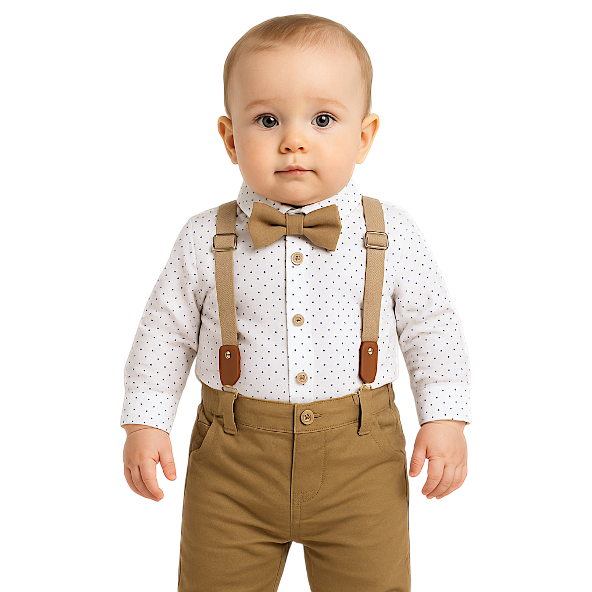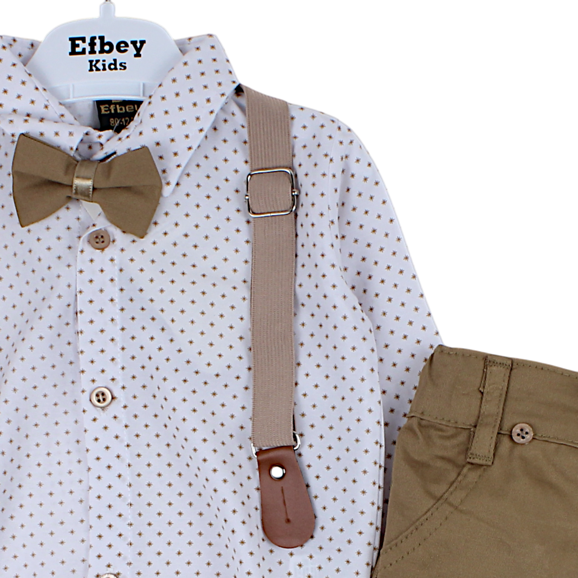 Beżowy komplet chłopięcy Efbey z szelkami i muszką