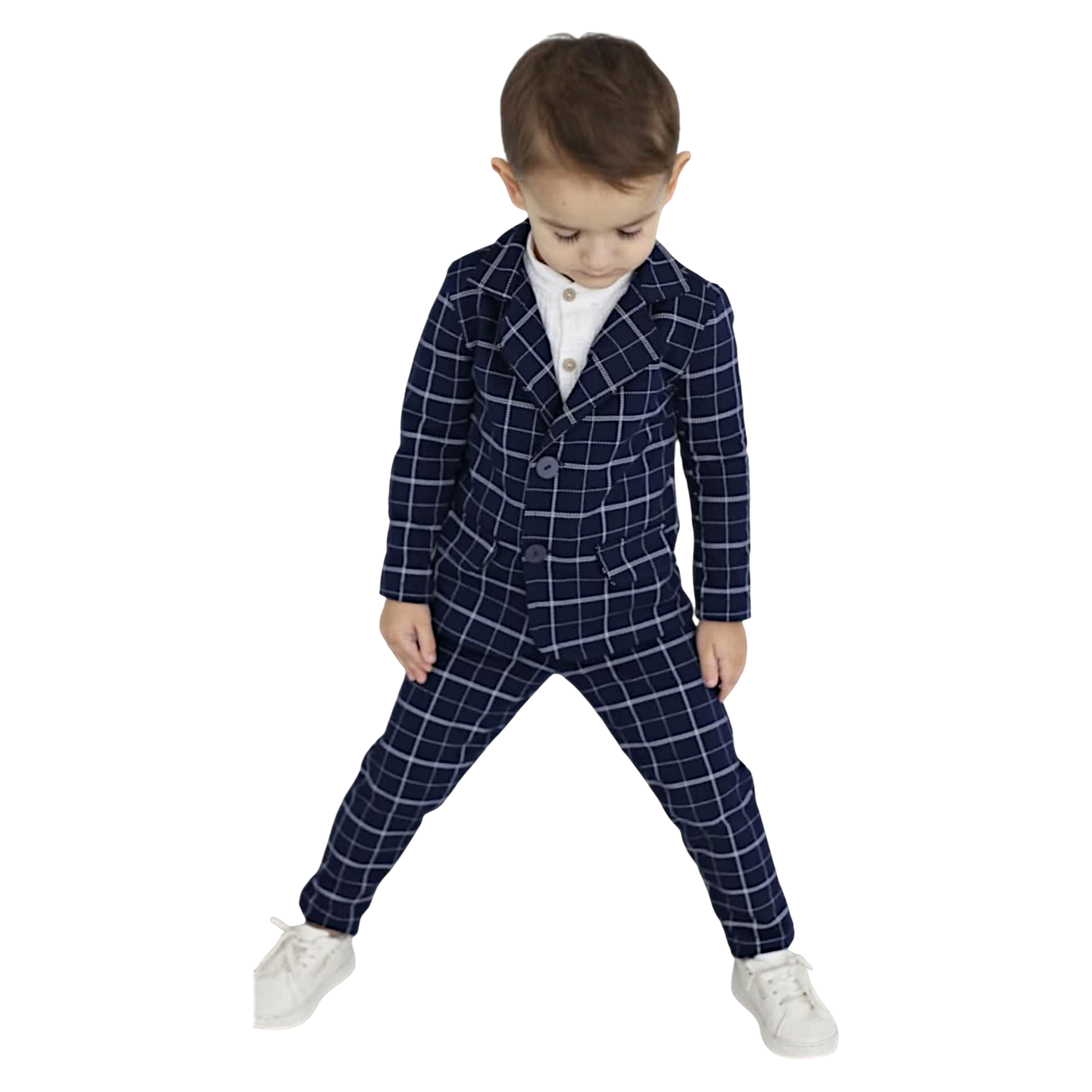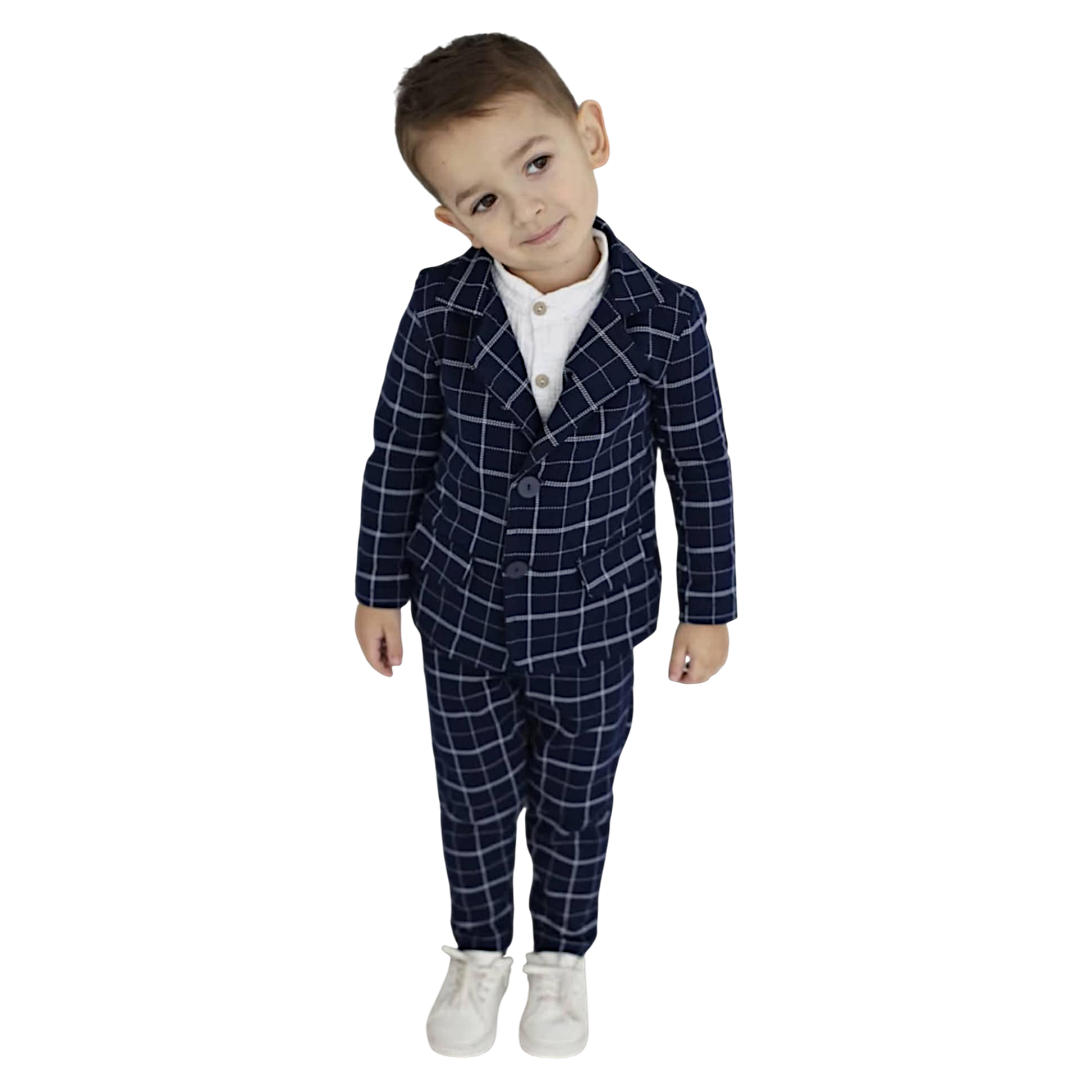 Stylowy komplet garniturowy dla chłopca w eleganckim granatowym kolorze, idealny na formalne okazje. Wykonany z wysokiej jakości tkanin, zapewnia komfort i elegancję. Marynarka posiada klasyczne zapięcie na guziki oraz kieszenie dodające funkcjonalności. Spodnie są dopasowane, z regulowanym pasem dla lepszego dopasowania. Całość tworzy kompaktowy dwuczęściowy zestaw, idealny na uroczystości i specjalne okazje.
