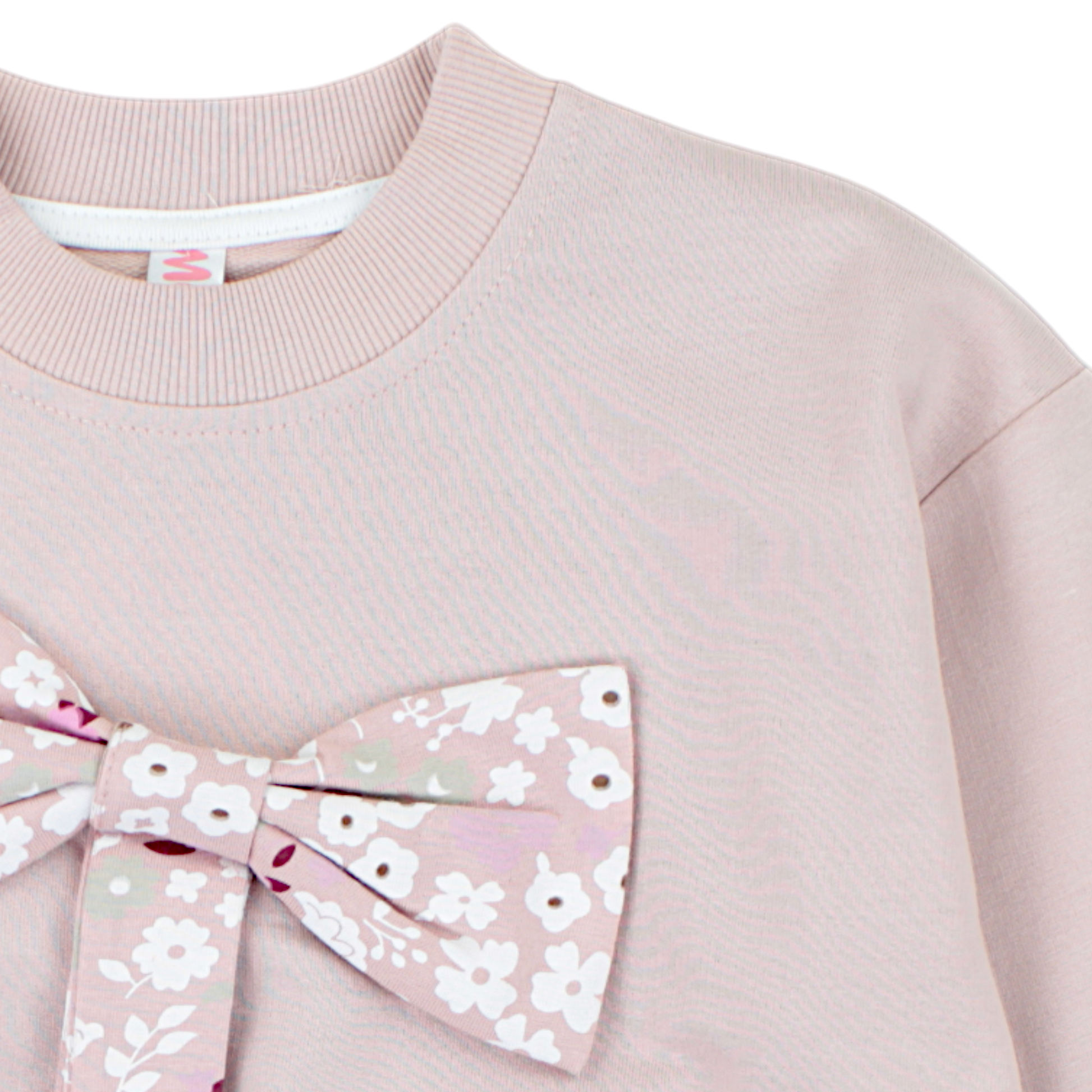 Komplet dziewczęcy z kokardą Mybella 259125-22125 to propozycja, która łączy styl i funkcjonalność, idealna na wiosenne i letnie dni. Góra zestawu to pastelowo-różowa bluza z długim rękawem, ozdobiona dużą kokardą w kwiatowym wzorze. Ta wyjątkowa aplikacja nadaje bluzie elegancji i czyni ją idealnym wyborem na różne okazje, od codziennych spacerów po rodzinne uroczystości. Dół zestawu to legginsy z identycznym kwiatowym motywem, które świetnie uzupełniają stylizację.