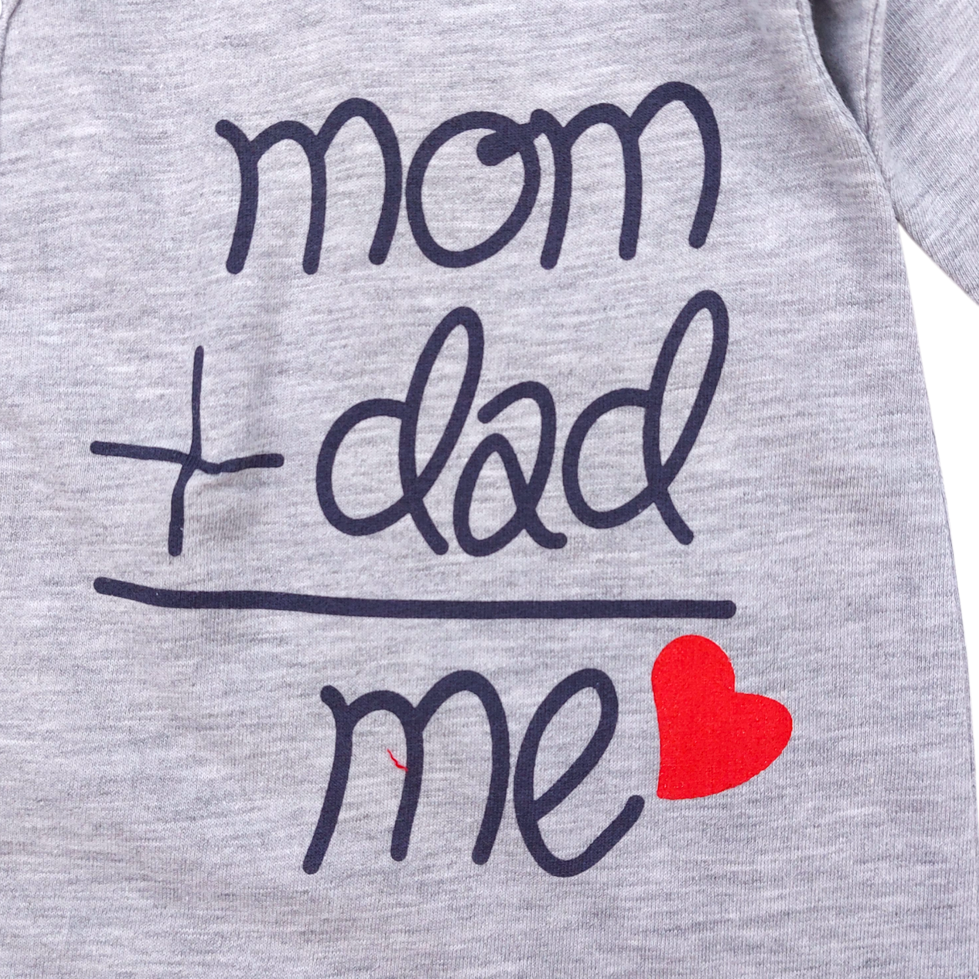 Uroczy komplet dziewczęcy składający się z pajacyka w kolorze popielatym oraz czerwonej czapeczki. Pajacyk zdobi nadruk z napisem "mom + dad = me" oraz czerwonym serduszkiem, co nadaje mu wyjątkowego uroku. Zapięcie na napy ułatwia przebieranie, a miękki materiał dba o komfort maluszka.