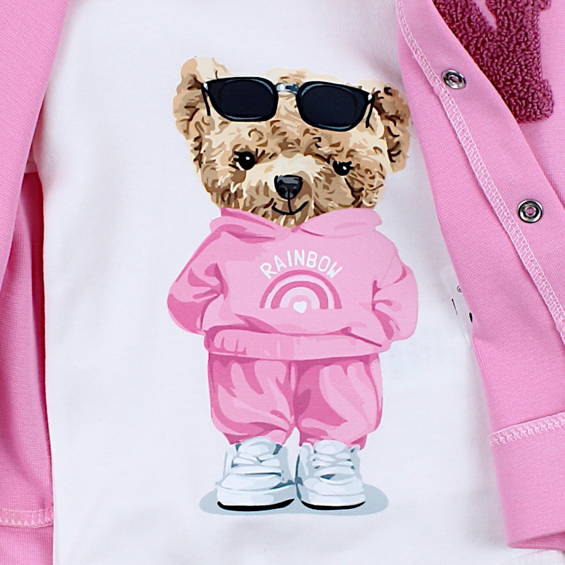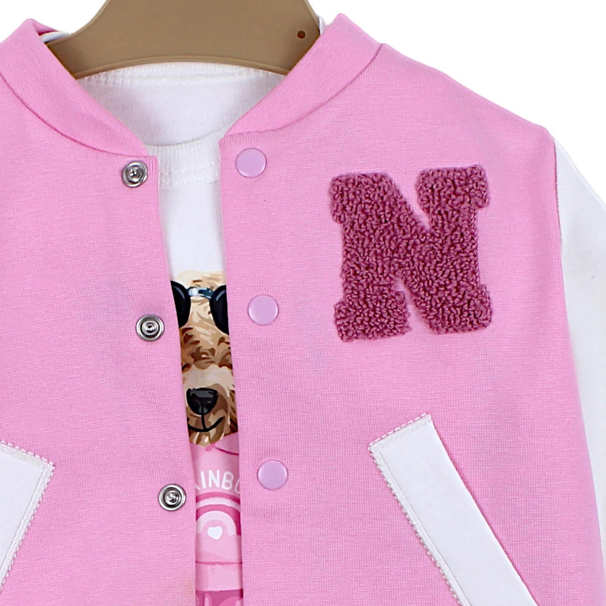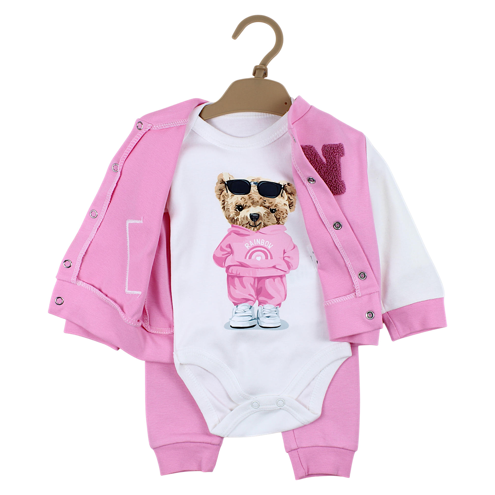 Przedstawiamy przepiękny komplet dla dziewczynki marki Simarik, który idealnie sprawdzi się wiosną i latem. Zestaw jest w kolorze różowym, co nadaje mu delikatny i dziewczęcy charakter. W skład kompletu wchodzą: body, spodnie i bluza. Bluza ma długi rękaw, dwie boczne kieszenie i efektowne, pluszowe zdobienie w postaci litery "N" na piersi, nadając jej sportowego stylu. Zapinana jest z przodu na napy, co ułatwia zakładanie i zdejmowanie. Body jest zdobione uroczym motywem misiem, zapinane w kroku na napy, co zapewnia wygodę przy zmianie pieluszki. Spodnie mają długie nogawki, które chronią przed chłodem, a elastyczna talia zapewnia wygodne dopasowanie. Całość wykonana jest z przyjemnych w dotyku materiałów, gwarantując komfort noszenia. To idealny wybór dla każdej małej dziewczynki, która chce czuć się wygodnie i wyglądać modnie.