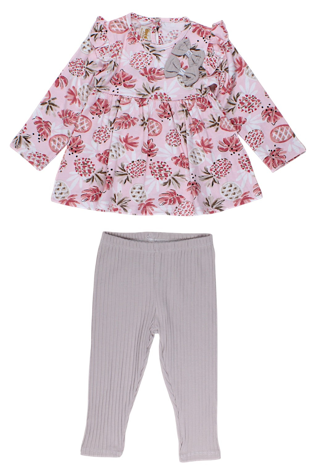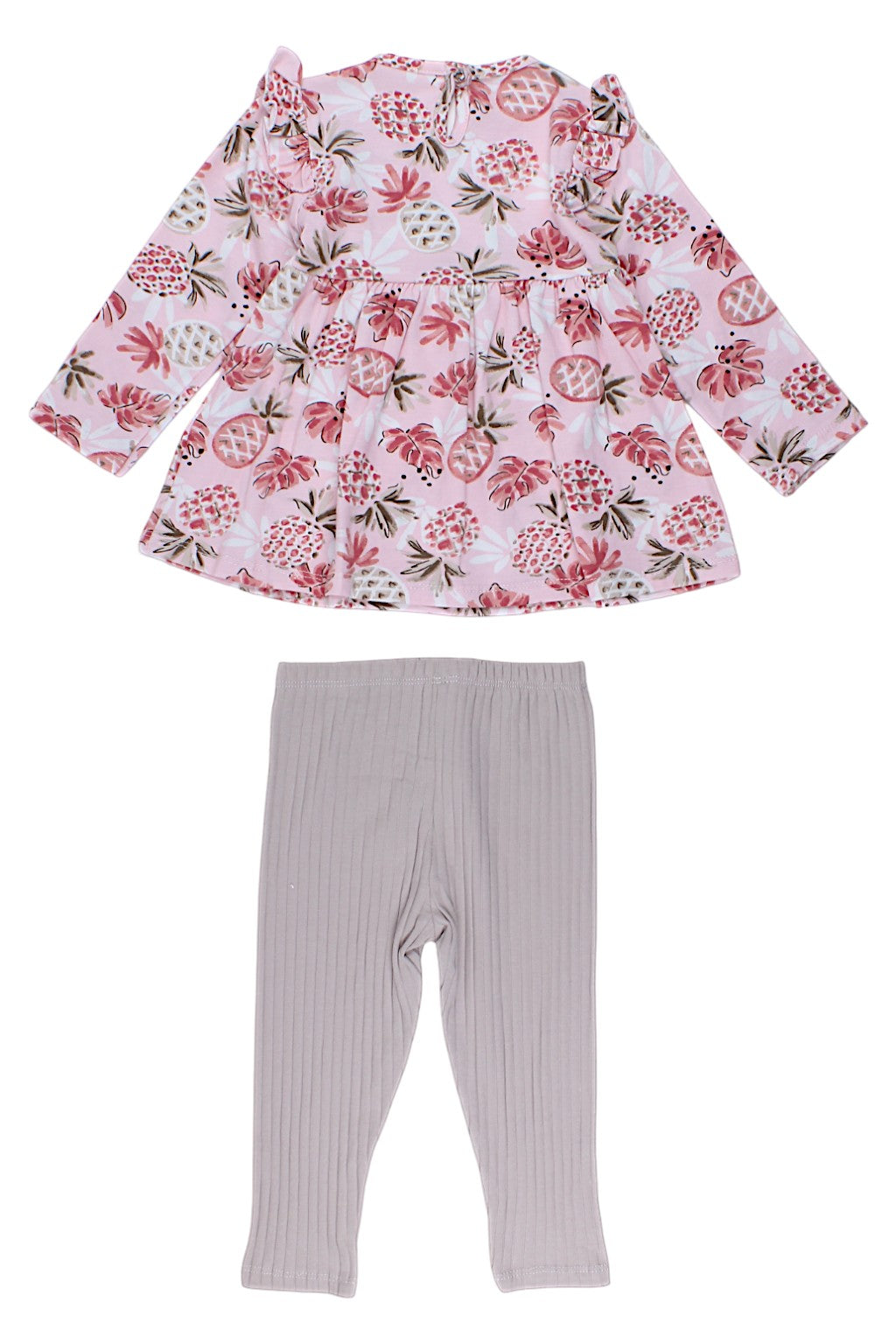 Ten uroczy komplet dziewczęcy w kolorze różowym składa się z bluzki i legginsów. Całość została wykonana z miękkiego materiału, zapewniającego komfort i swobodę ruchów. Bluzka jest bez rękawów z delikatnym, dekoracyjnym wzorem, a legginsy są dopasowane i elastyczne, idealnie przylegające do ciała. W zestawie brak kieszeni i zapięć, dzięki czemu ubieranie dziecka jest łatwe. Komplet sprawdzi się zarówno na co dzień, jak i na wyjątkowe okazje, podkreślając dziewczęcy urok małej księżniczki.