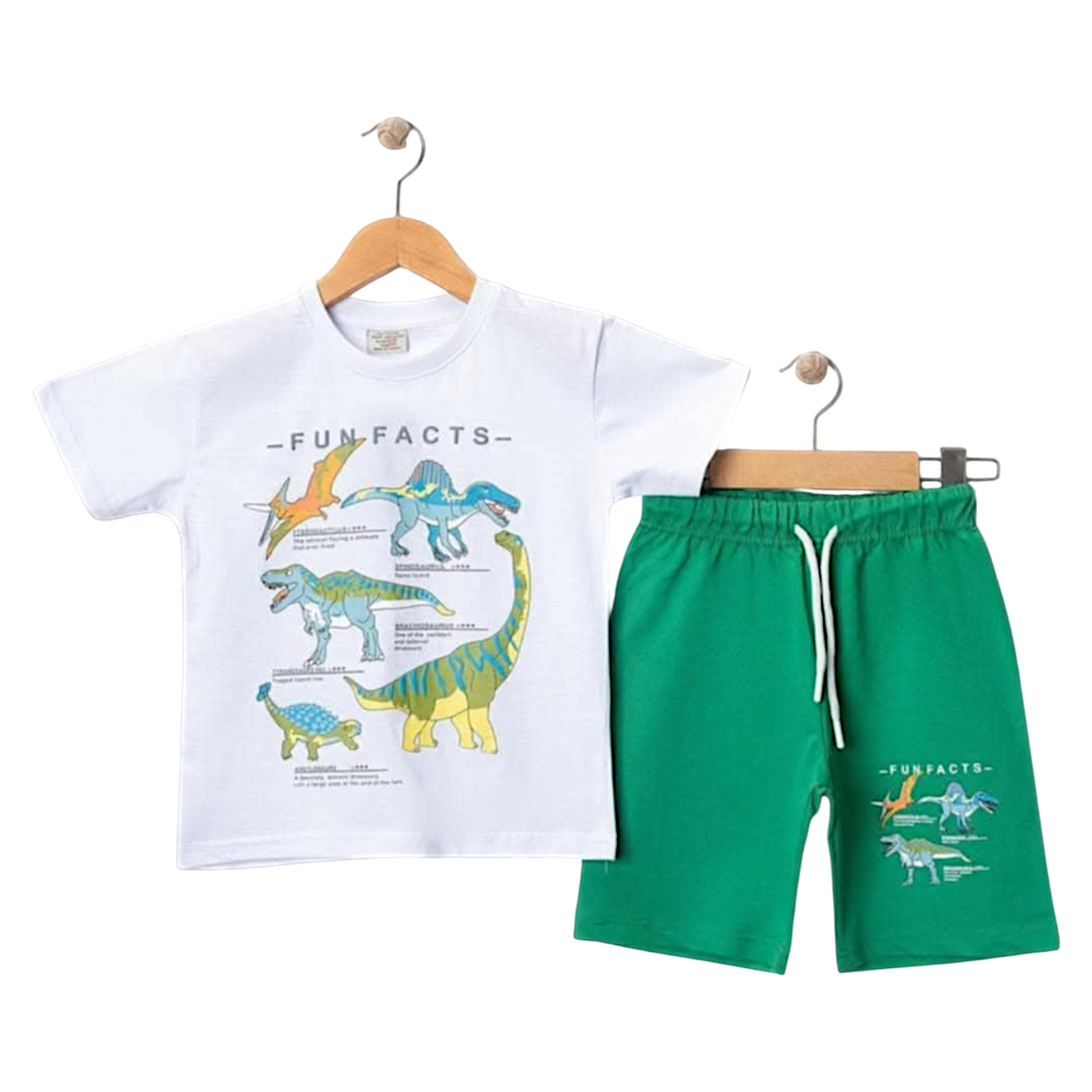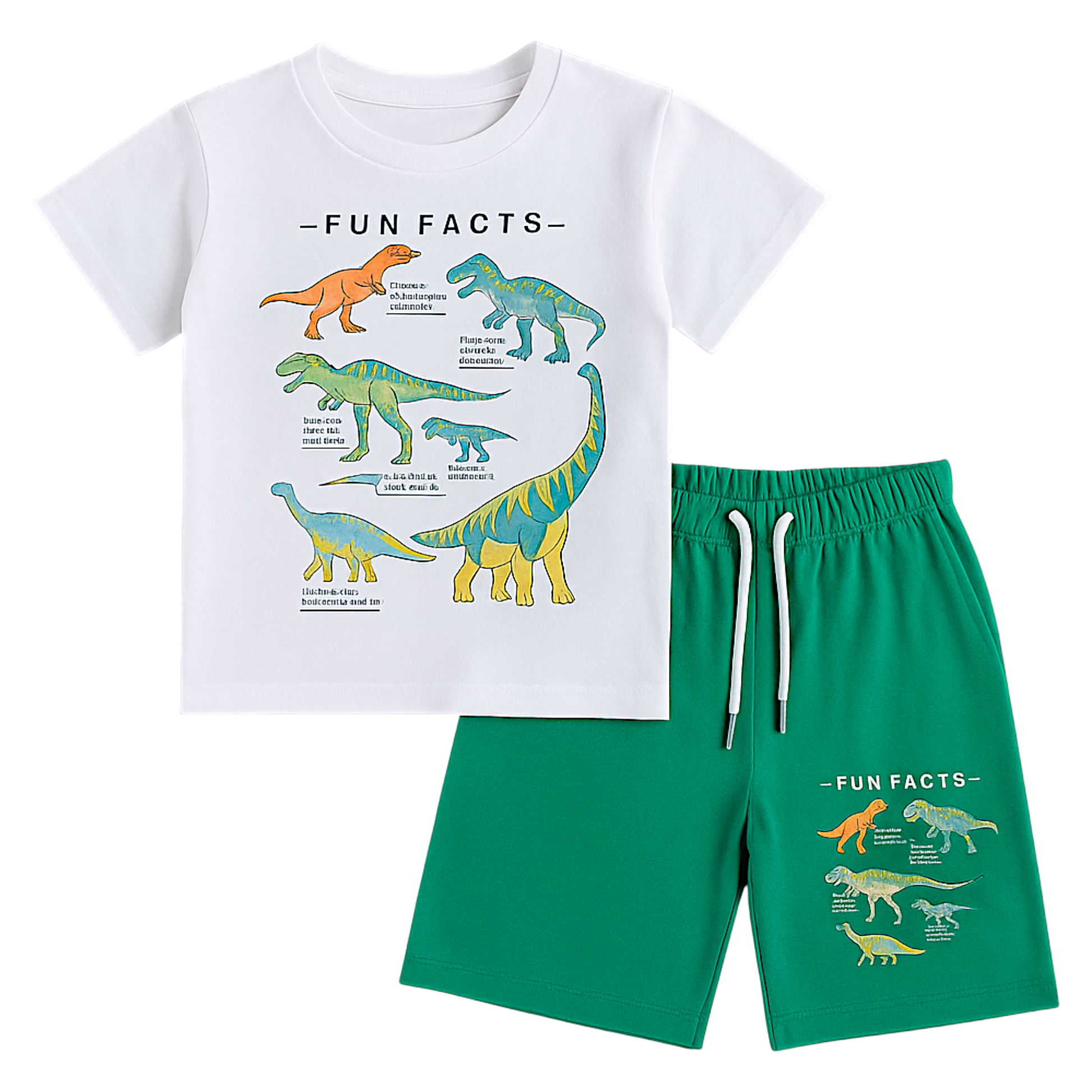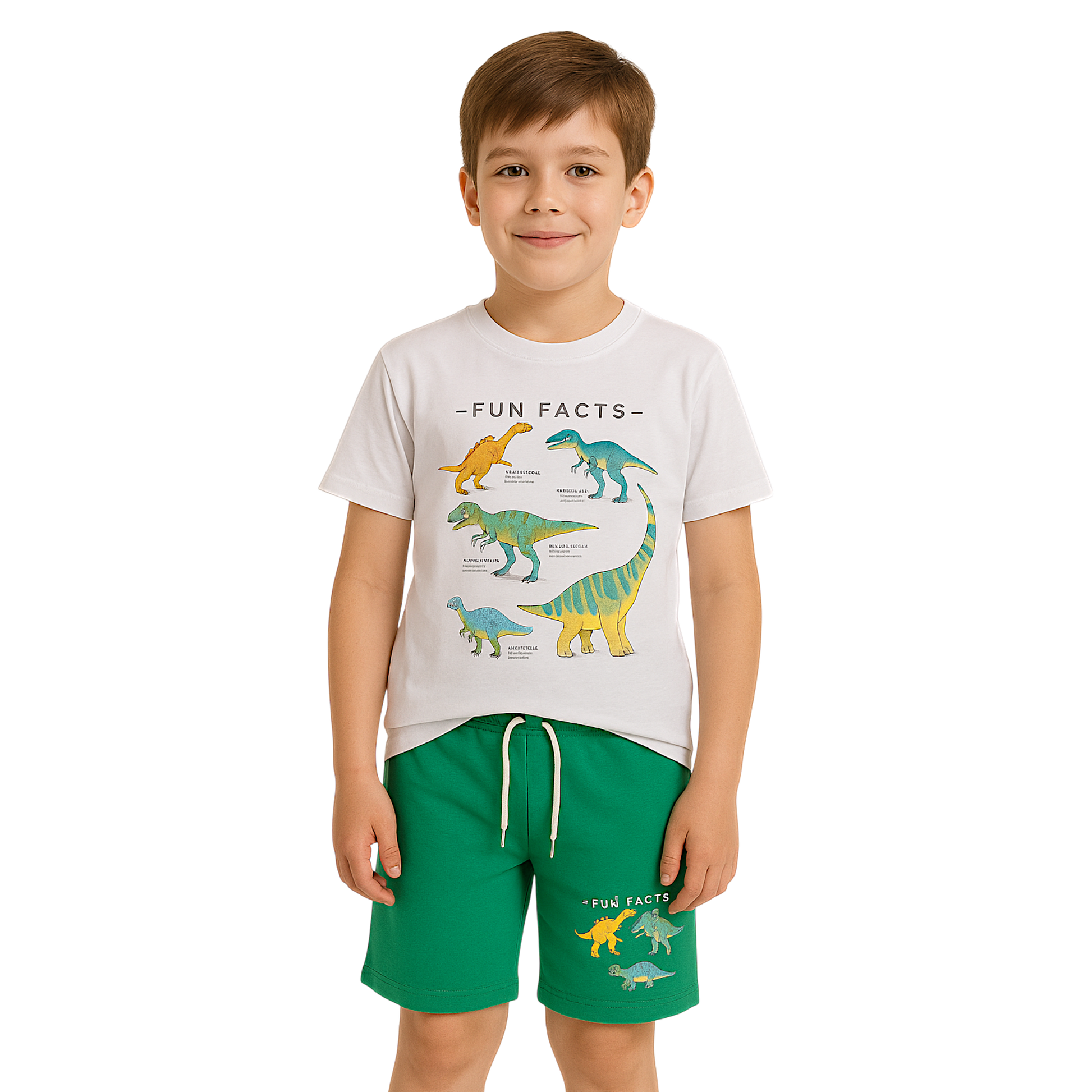 Przedstawiamy kompletny zestaw dziecięcy, idealny dla każdego małego odkrywcy zainteresowanego światem dinozaurów. Ten uroczy komplet chłopięcy składa się z dwóch części: t-shirta i szortów, idealnych na cieplejsze dni. Zarówno koszulka, jak i spodenki wykonane są z przyjemnej w dotyku, białej bawełny, która jest oddychająca i delikatna dla skóry dziecka.