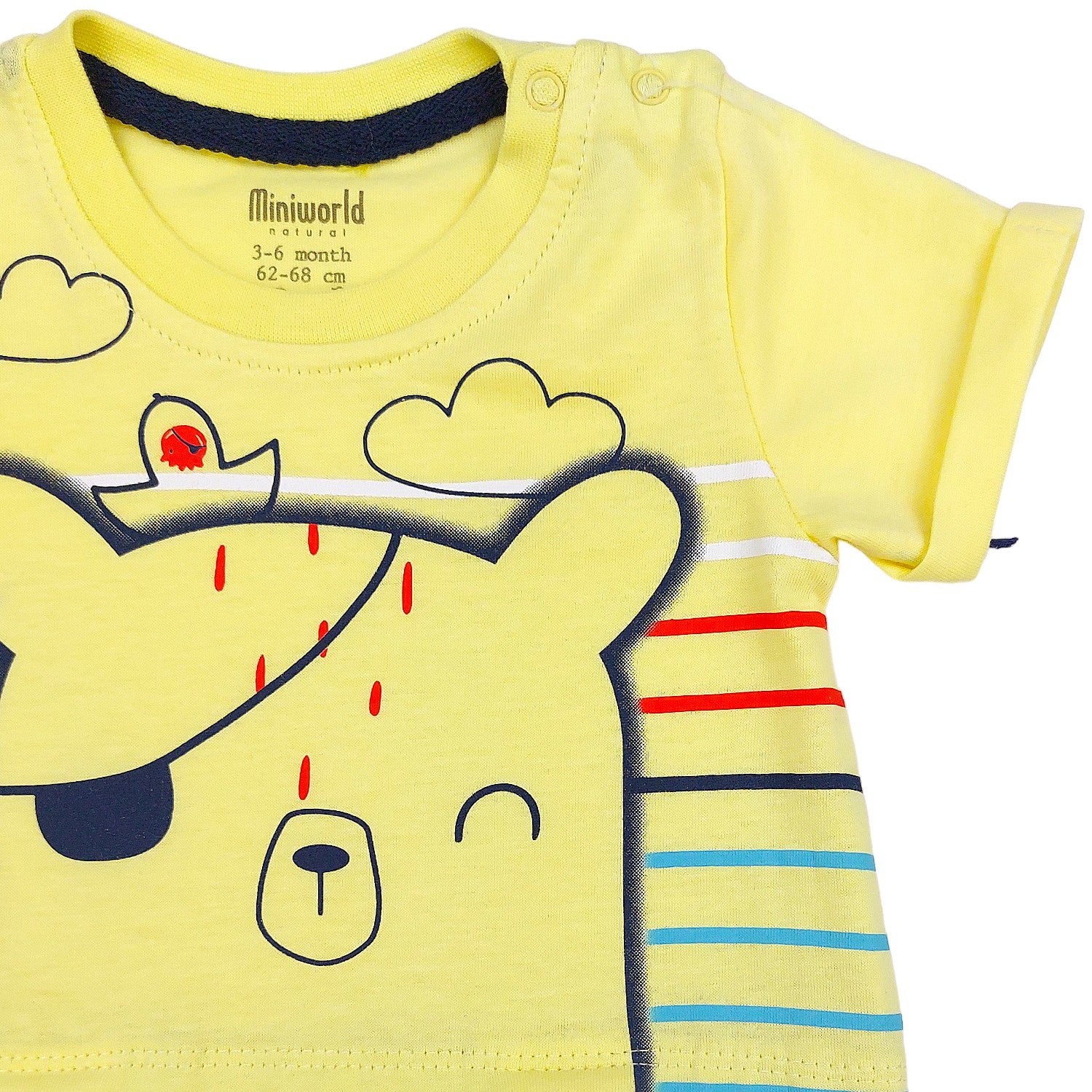 Ten model rampersa zdobi wesoły nadruk przedstawiający uroczego misia pirata oraz kolorowe rybki, które nadadzą każdemu maluchowi przyjemny, dziecięcy styl. Kolory takie jak żółty i granatowy tworzą harmonijną całość, idealną dla małych odkrywców. Taki motyw pobudza wyobraźnię dziecka i z pewnością przyciągnie uwagę zarówno rodziców, jak i ich pociech.