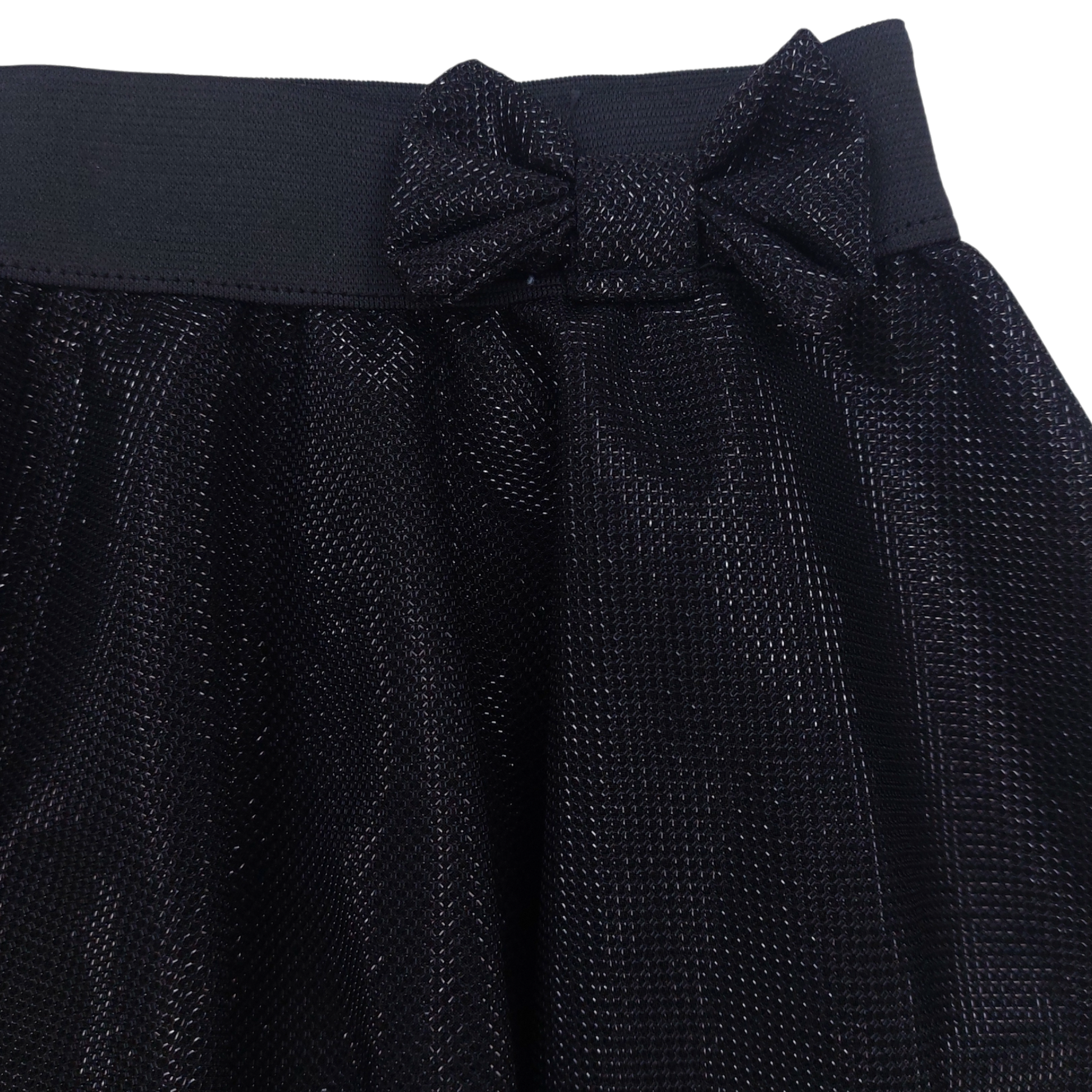 Elegancka spódniczka dziewczęca z połyskującego materiału w kolorze czarnym, idealna na wyjątkowe okazje w sezonie jesień-zima. Model ozdobiony subtelną kokardką w pasie, z warstwową tiulową podszewką dodającą objętości i efektownego wyglądu. Przedział rozmiarowy 92-122.