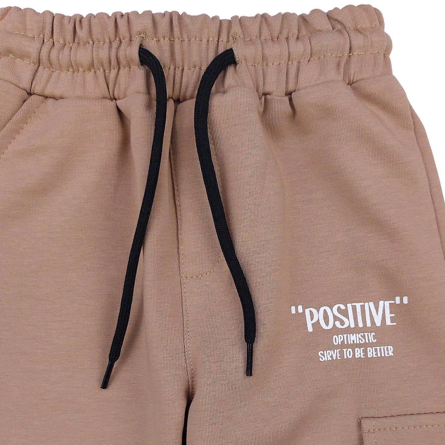 Spodnie wyróżniają się starannie przemyślanym designem. Elastyczna gumka w pasie z czarnymi troczkami pozwala na idealne dopasowanie, zapewniając maksymalną wygodę noszenia. Ściągacze u dołu nogawek nie tylko dodają sportowego charakteru, ale również sprawiają, że spodnie dobrze leżą i chronią nogi przed przewiewami. Kieszonka boczna na nogawce to element praktyczny i stylowy — idealny do schowania drobnych przedmiotów, takich jak chusteczki lub mała zabawka. Dodatkowo, minimalistyczne nadruki w formie napisu "Positive" dodają spodniom nowoczesnego wyglądu, który spodoba się zarówno dzieciom, jak i rodzicom.