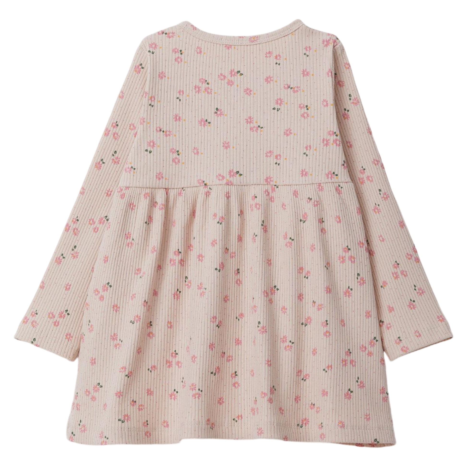 Urocza sukienka dziewczęca z kolekcji jesień-zima w kolorze beżowym, ozdobiona delikatnym wzorem kwiatów. Wykonana z miękkiej bawełny w prążki, z dodatkiem elastanu, co zapewnia komfort noszenia. Długie rękawy oraz zapięcie na dwa guziki przy dekolcie dodają elegancji, a rozkloszowany krój sukienki zapewnia swobodę ruchu. Idealna na co dzień, jak i na specjalne okazje.