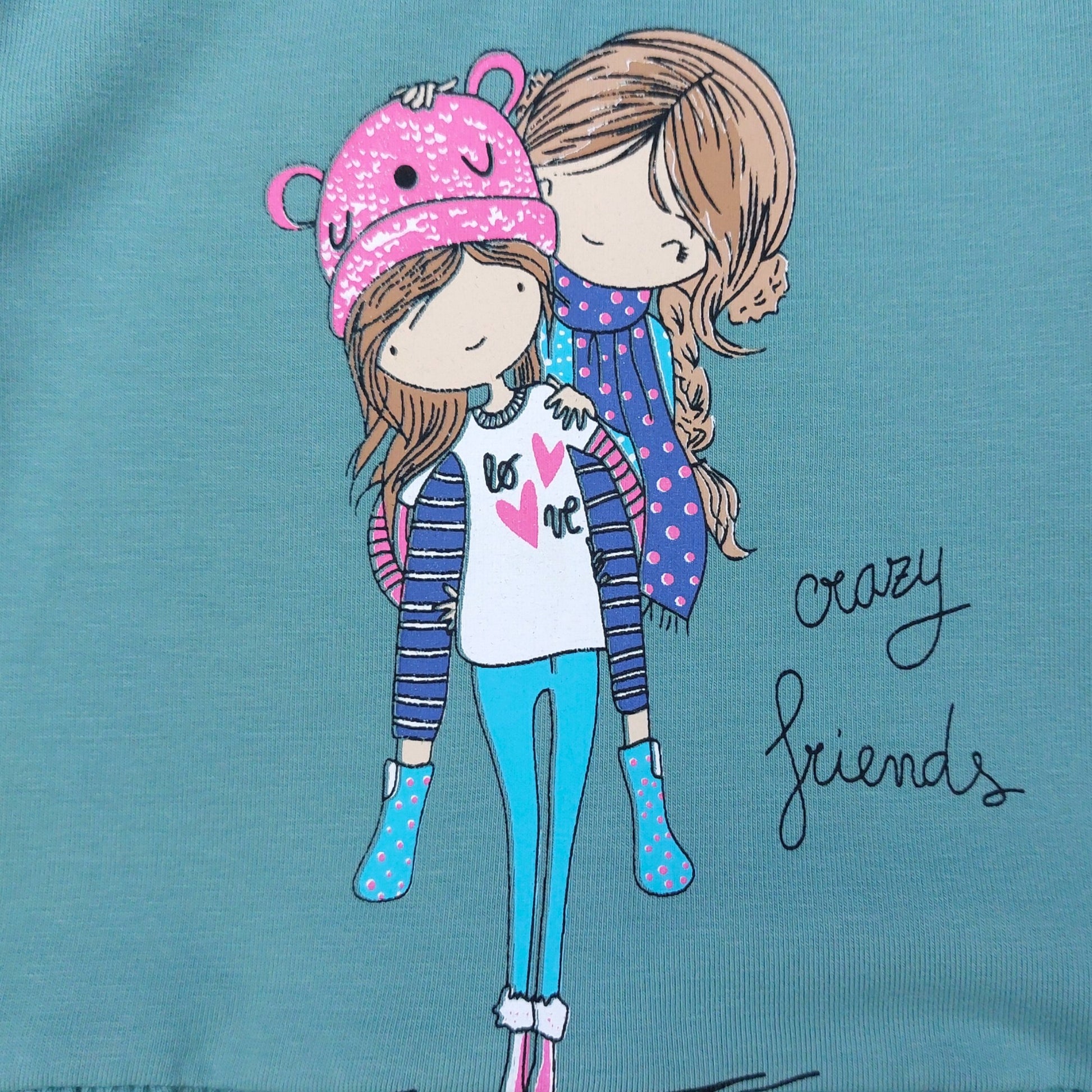 Sukienka bawełniana Breeze 20852-30924 w kolorze szałwiowym, z grafiką przedstawiającą dwie przyjaciółki i napisem "Crazy Friends". Sukienka ma długie rękawy i delikatne marszczenie w talii, co nadaje jej dziewczęcy urok. Idealna na sezon jesień-zima.