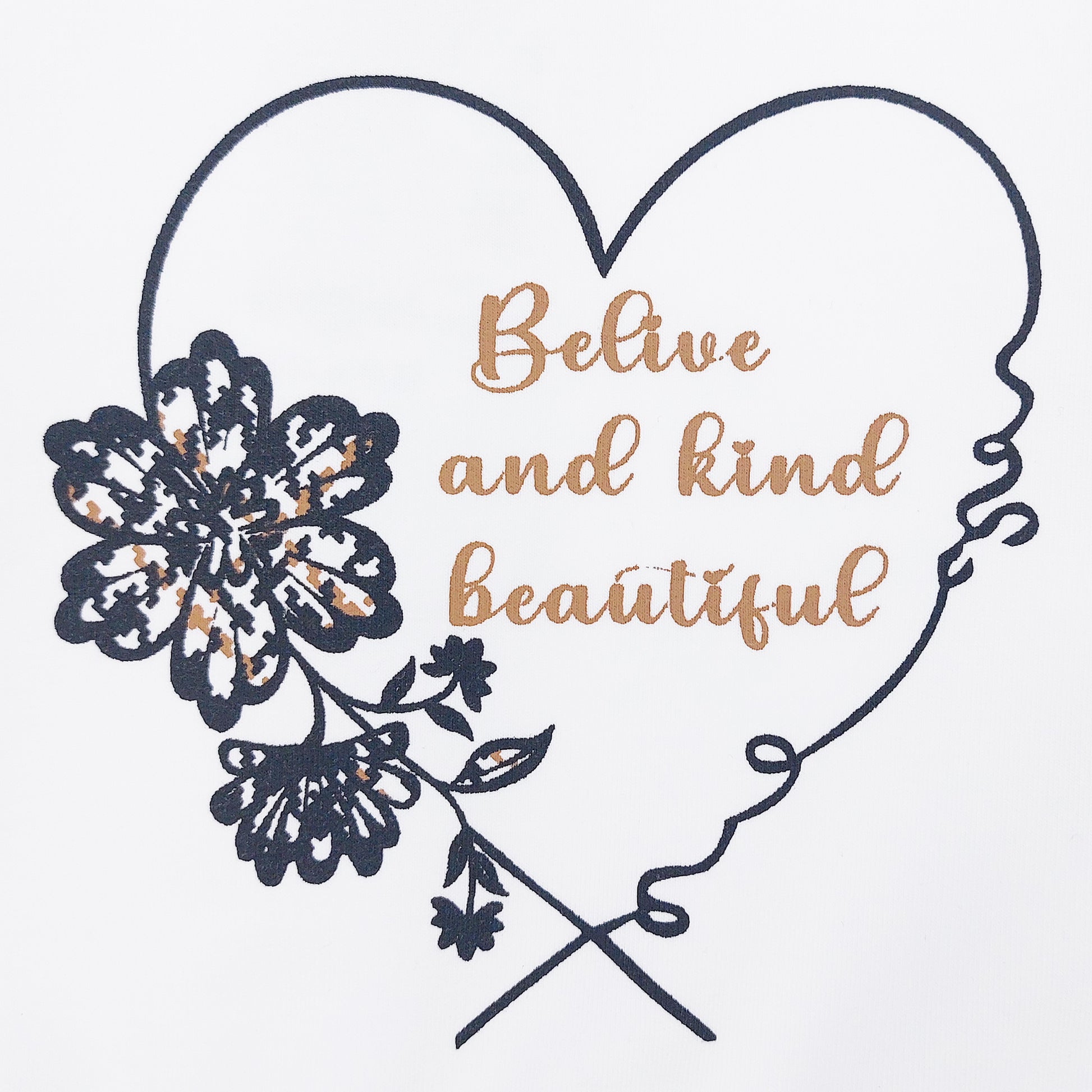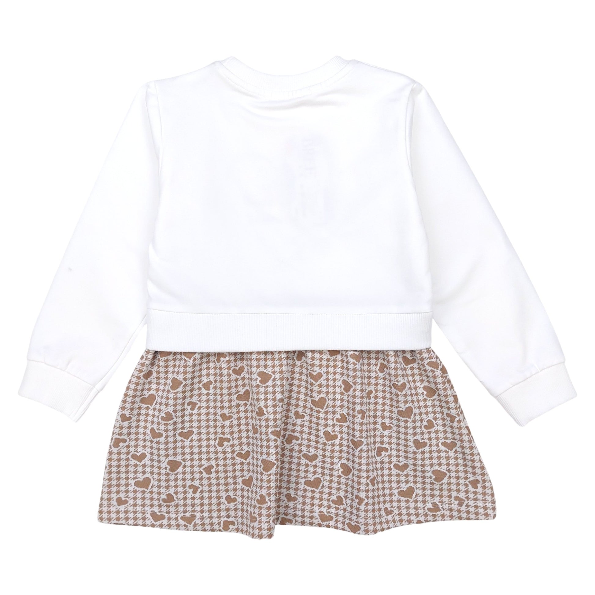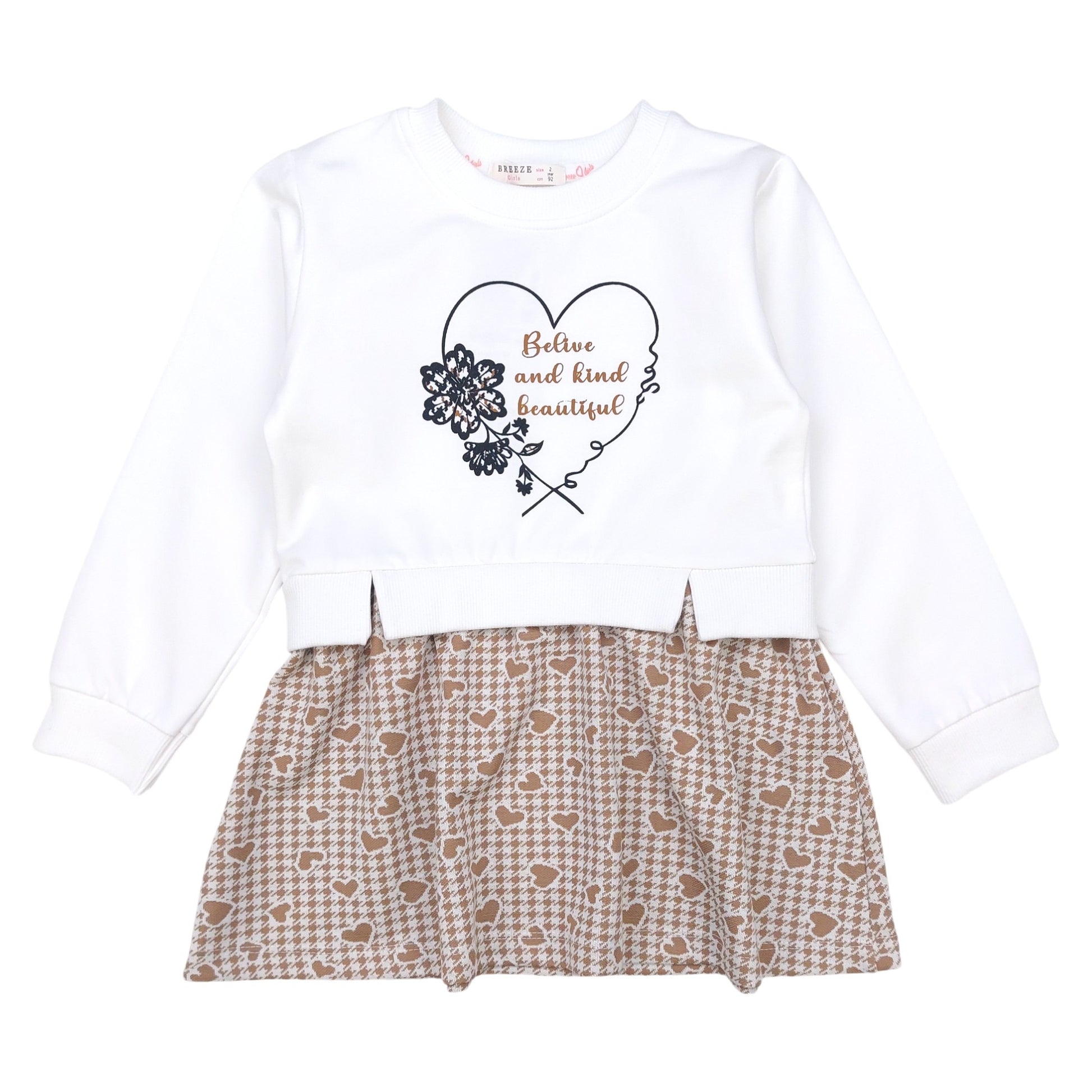 Dziewczęca sukienka w kolorze beżowym, idealna na sezon jesień-zima. Góra sukienki ozdobiona jest nadrukiem serca z kwiatowym motywem i napisem "Believe and kind beautiful". Sukienka ma długie rękawy, a dolna część w delikatny wzór w serca na tle kratki dodaje jej dziewczęcego uroku. Brak kieszeni i zapięć, sukienka jest wkładana przez głowę, co czyni ją bardzo wygodną do codziennego noszenia.