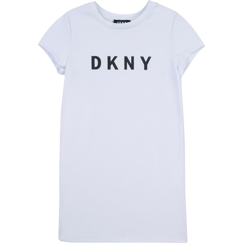 Sukienka sportowa krótkim rękawem i nadrukiem dziewczęca DKNY z kolekcji wiosna-lato kod produktu D32785-N50 kolor biało-czarny. Ubrania dziecięce.