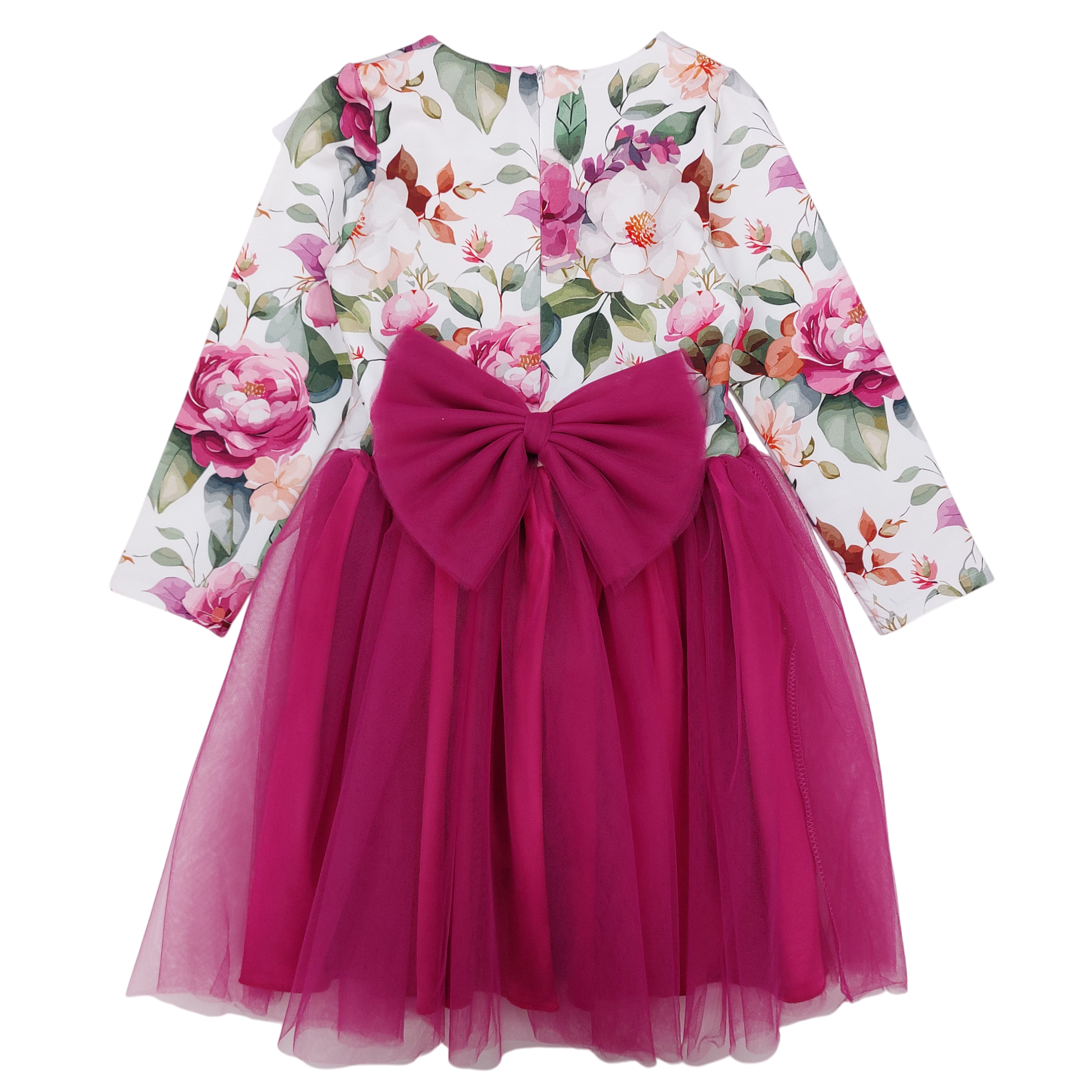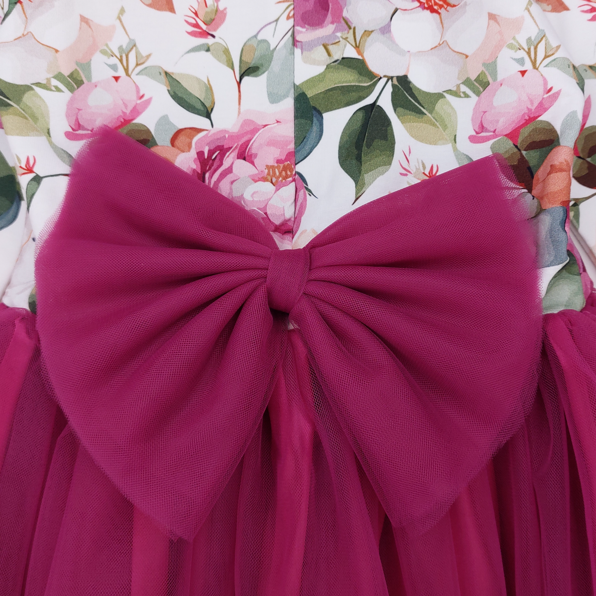 Sukienka dziewczęca Katerina w kolorze fuksji to idealny wybór na wyjątkowe okazje. Góra sukienki wykonana jest z materiału w kwiatowy wzór, natomiast dół zdobi efektowna warstwowa tiulowa spódnica. Model posiada długie rękawy oraz dużą kokardę z tyłu, która dodaje elegancji i uroku. Sukienka zapinana jest na kryty zamek z tyłu, co ułatwia zakładanie. Idealna na uroczystości, takie jak święta, wesela czy urodziny.