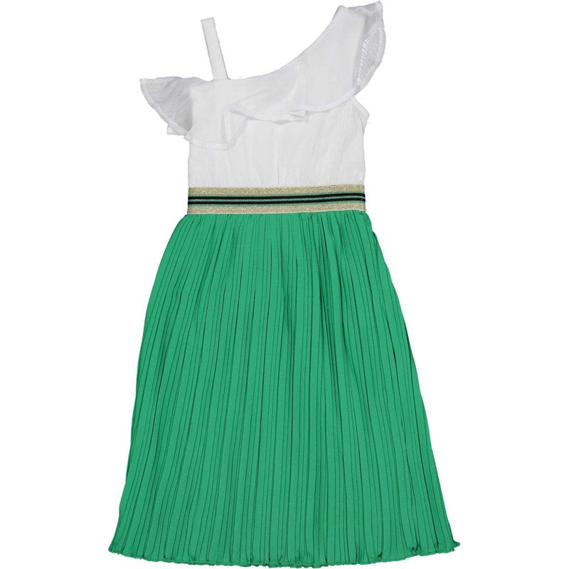 sukienka dla dzieci asymetryczna góra z falbanką, plisowany dół dla dziewczyn TRYBEYOND z kolekcji wiosna-lato kod produktu 25577 kolor 25P biały/zielony. Ubranka dziecięce.