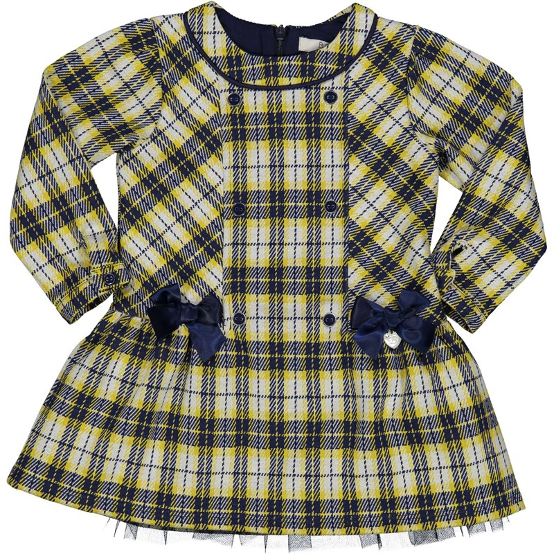 Sukienka w kratkę dla dzieci elegancka z długim rękawem i ozdobnymi kokardkami dla dziewczynek Birba&Trybeyond z kolekcji jesień zima kod produktu 95307 kolor 93Z Granat/żółty. Ubranka dla dzieci.