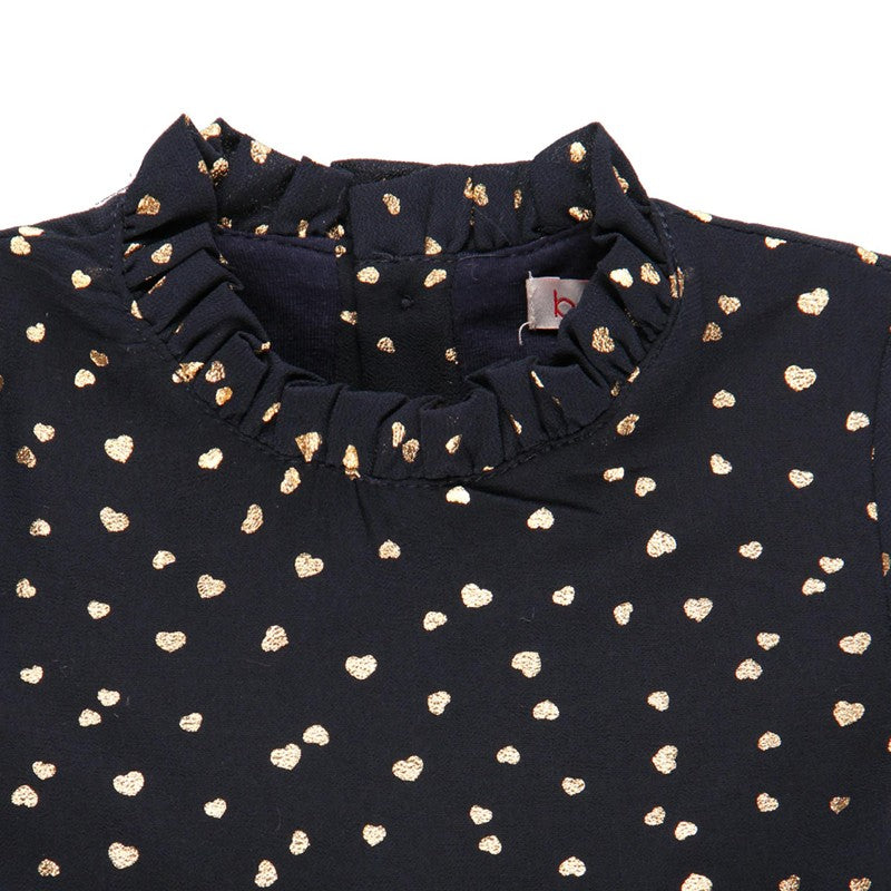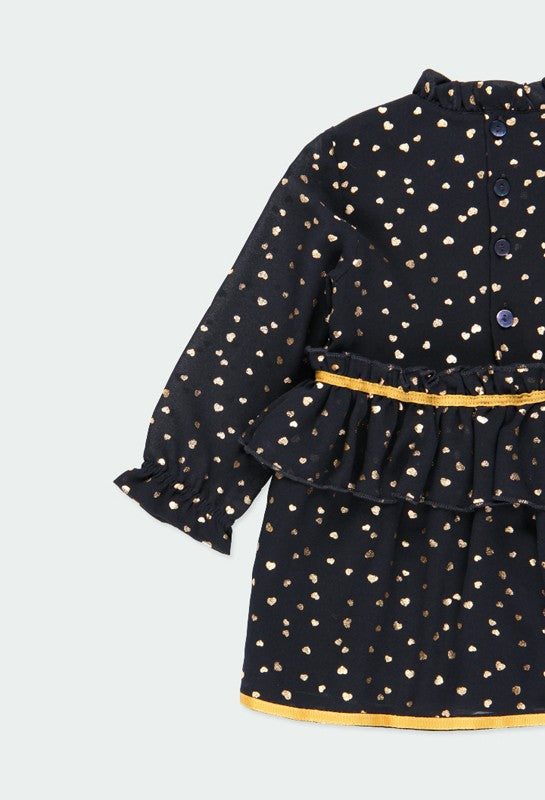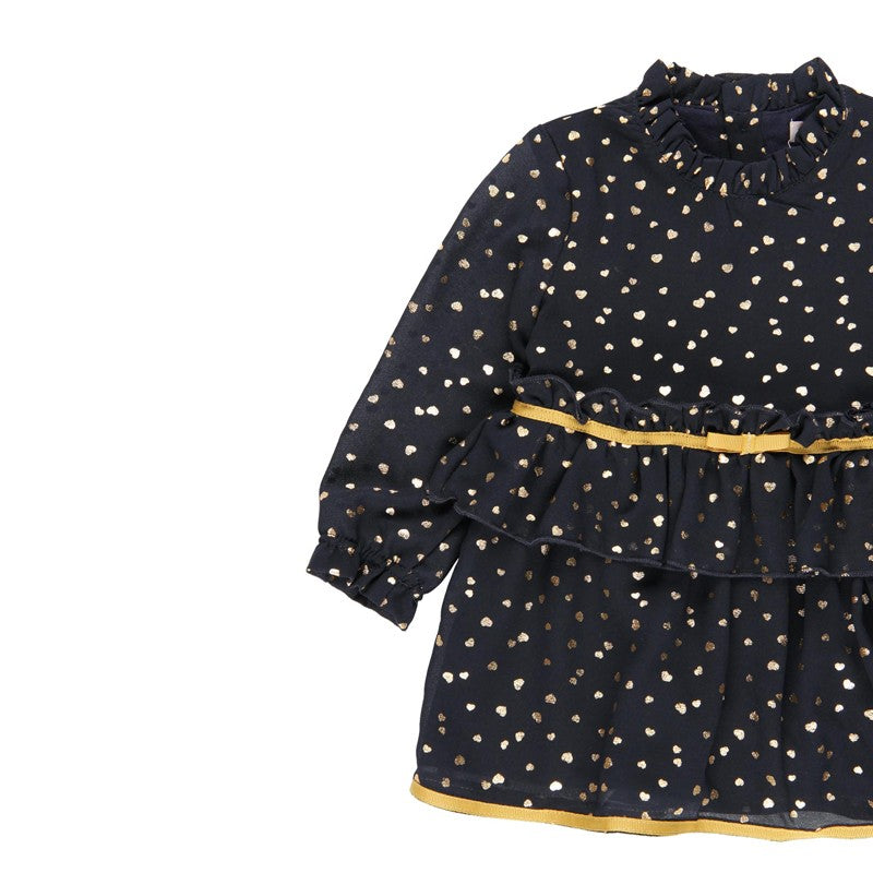 Szyfonowa sukienka dla dziewczynki Baby dla dzieci z długim rękawem i nadrukiem w serduszka dziewczynka Boboli z kolekcji jesień zima kod produktu 701132 kolor granatowy. Odzież dziecięca.