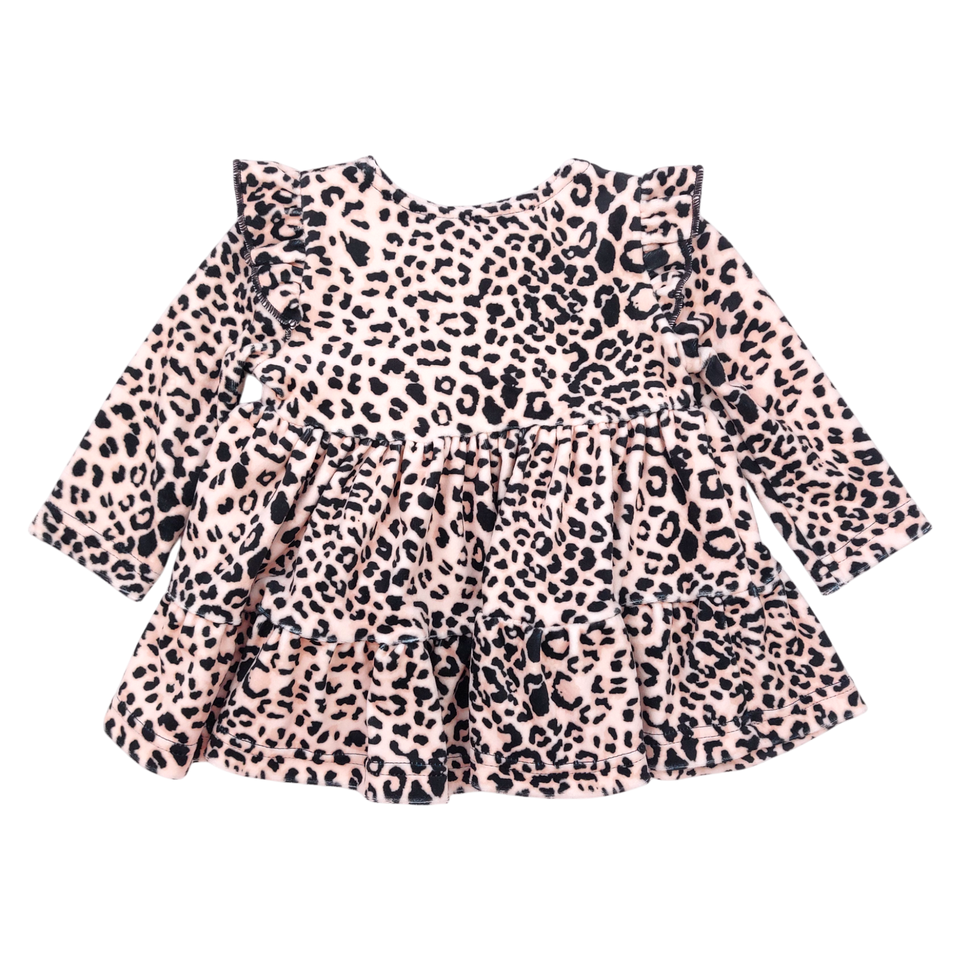 Krótka, urocza sukienka dziewczęca z delikatnego weluru o wzorze panterki. Sukienka z długim rękawem, wykończona falbankami na ramionach oraz ozdobną kokardą na przodzie. Posiada rozkloszowany krój, który zapewnia wygodę i swobodę ruchów. Idealna na chłodniejsze dni dzięki miłemu w dotyku materiałowi i ciepłemu wykończeniu. Bez zapięć - zakładana przez głowę.