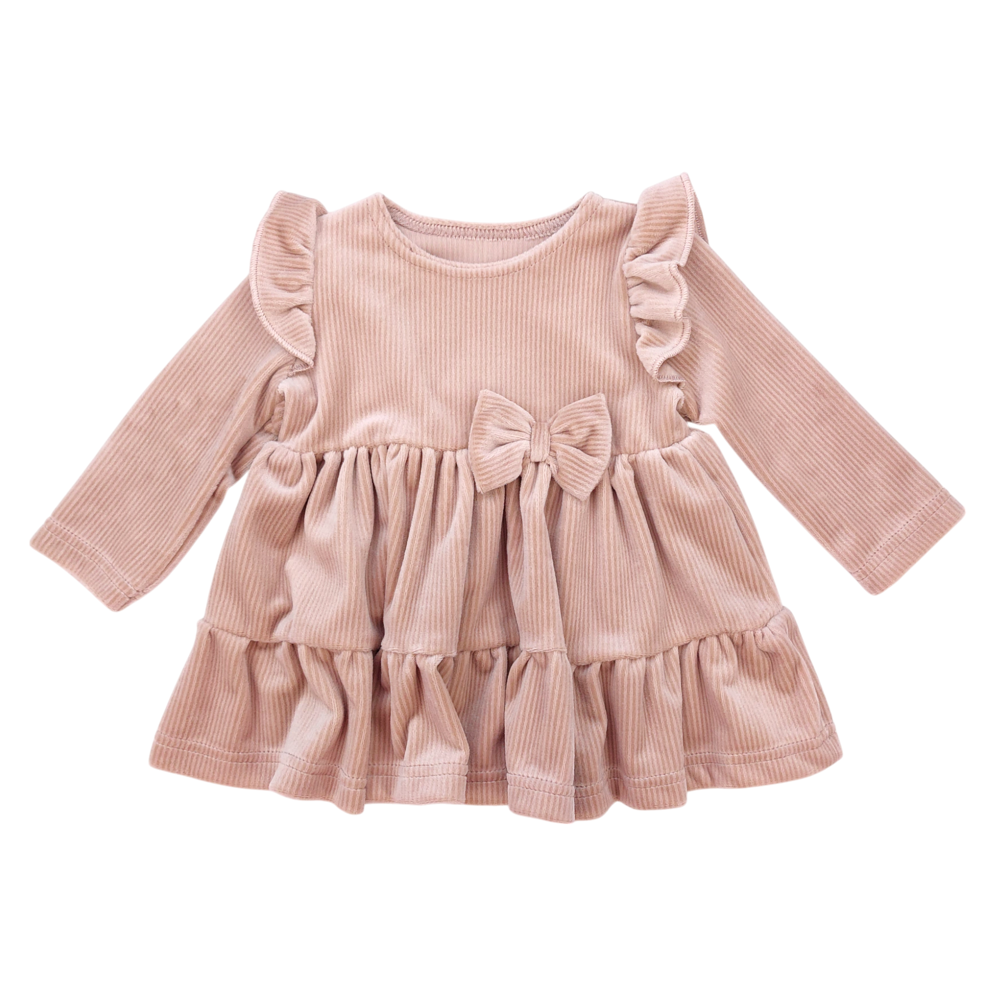 Ta sukienka dziewczęca to idealny wybór na jesień i zimę. Wykonana z miękkiego, welurowego materiału w prążki, zapewnia komfort i elegancki wygląd. Posiada długie rękawy, falbanki przy ramionach oraz dekoracyjną kokardę w pasie, dodając całości uroku. Sukienka ma klasyczny, beżowy kolor, który doskonale komponuje się z każdą stylizacją. Spódnica jest rozkloszowana, co nadaje jej dziewczęcego charakteru.