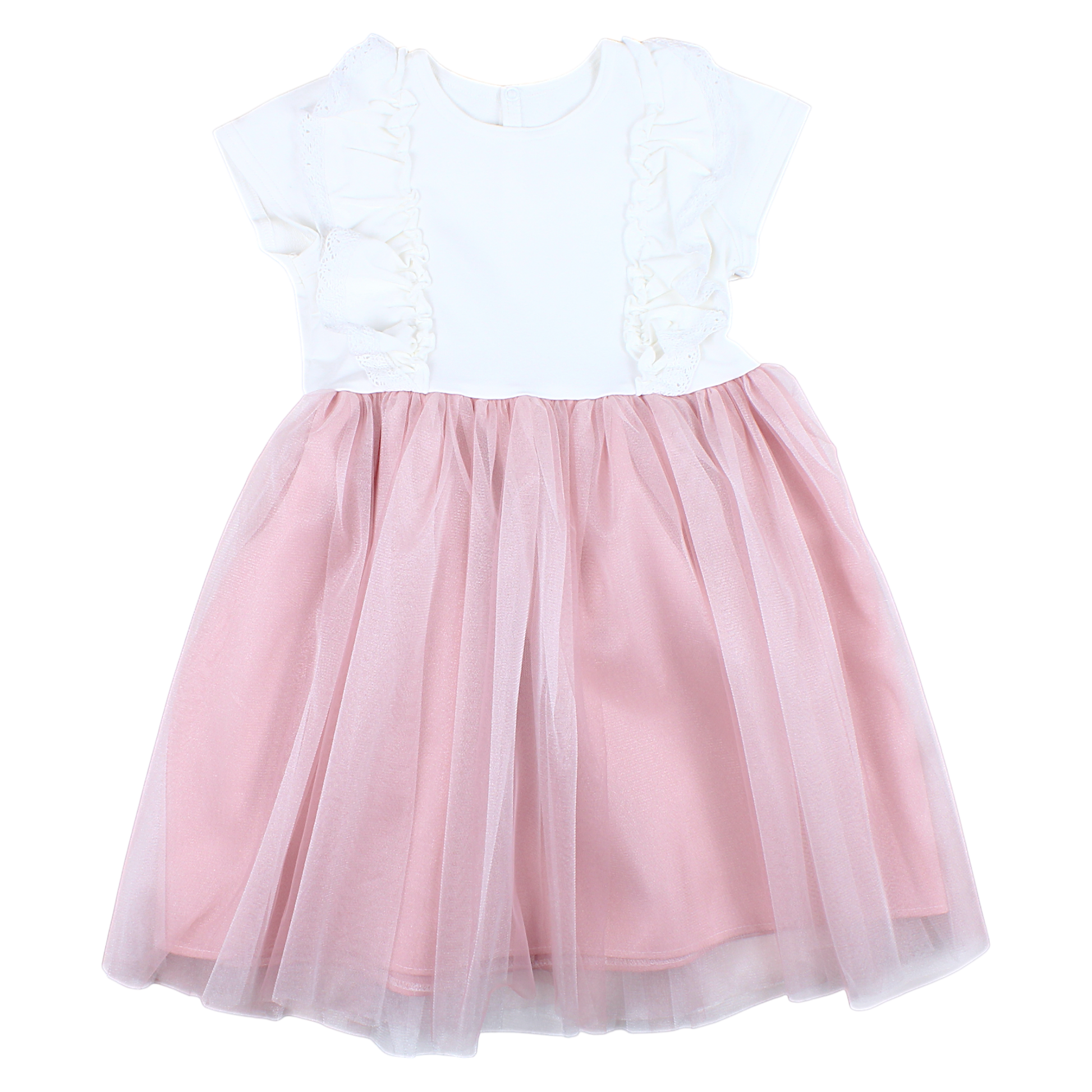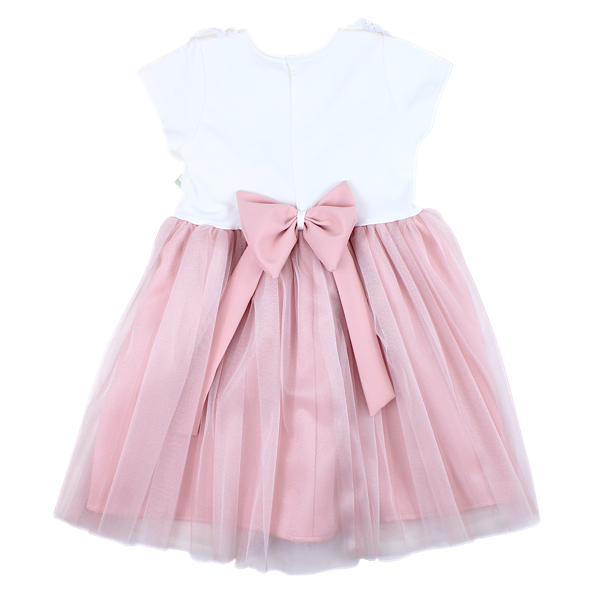 Ta urocza sukienka wizytowa dla dziewczynki wykonana jest z delikatnej koronki w kolorze pudrowego różu. Góra sukienki ma krótkie rękawy i zdobiona jest subtelnymi falbankami, które dodają elegancji. Sukienka posiada zapięcie na suwak z tyłu, co ułatwia zakładanie. Dół sukienki jest rozkloszowany i ozdobiony tiulową warstwą, która dodaje lekkości i wdzięku. To idealny wybór na specjalne okazje, takie jak wesela czy przyjęcia.